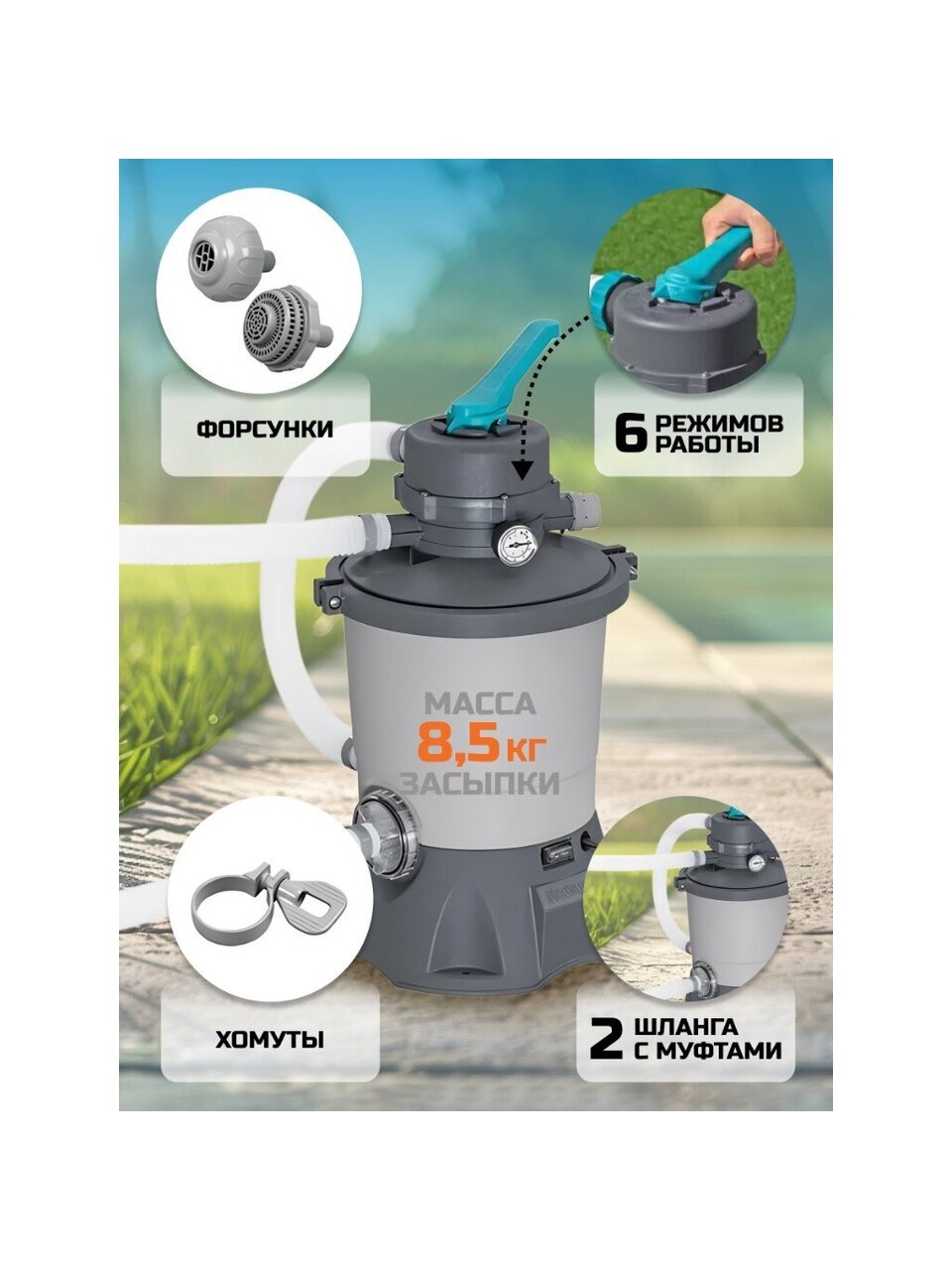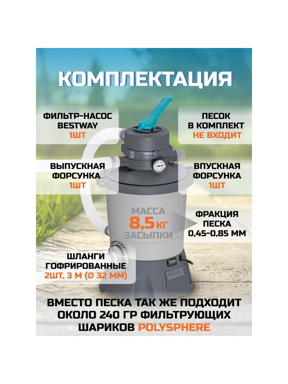 - Совместимость с различными наполнителями: работает как с кварцевым песком №20 (0.45-0.85 мм) в количестве 8.5 кг, так и с высокоэффективным продуктом Polysphere #58475 в количестве 240 г, что позволяет выбрать оптимальный вариант для вашего бассейна(наполнитель или песок в комплект не входят).