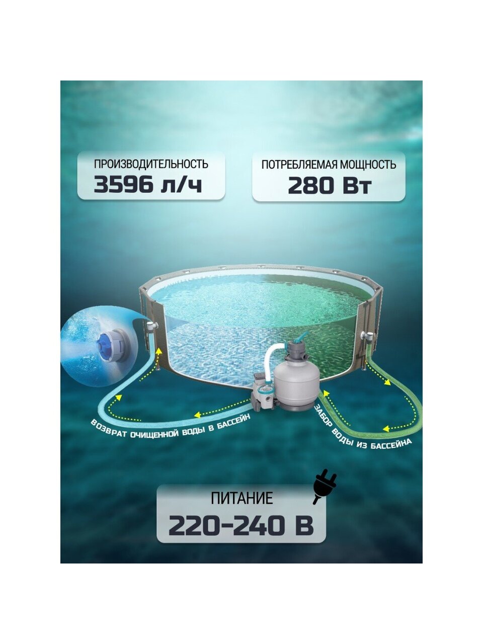 - Универсальность: подходит для бассейнов объемом от 1100 до 16600 литров, что делает его идеальным выбором для различных размеров бассейнов.