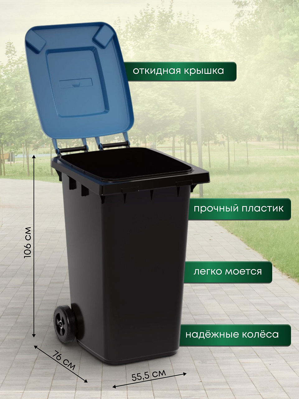 Вы можете приобрести «Бак для мусора пластик, 240 л, с крышкой, с колесами, 55.5х76х106 см, черно-синий, Альтернатива, М5938» и другие товары в нашем интернет-магазине в Липецке по низким ценам и с бесплатным самовывозом.