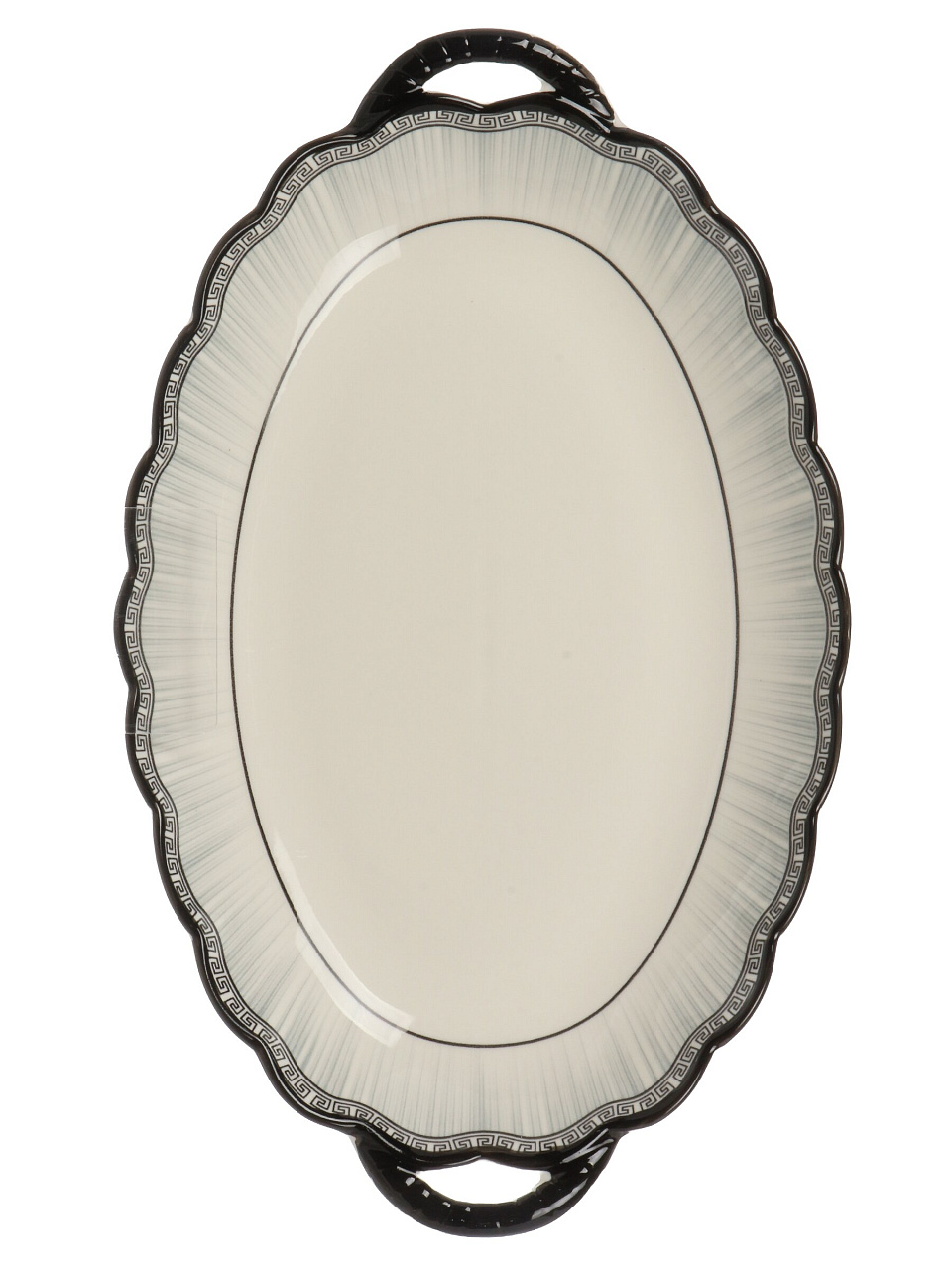 Длина 31 см, овальная форма, белый цвет с рисунком, эргономичные ручки, бортики, подарочная упаковка. Материал — керамика, подходит для СВЧ и посудомоечной машины.