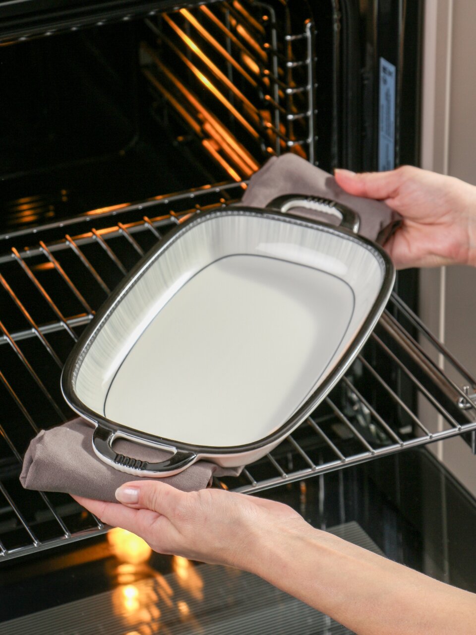 Благодаря ручкам удобно переносить горячие блюда, не обжигая руки, и безопасно сервировать на стол даже крупные порции.