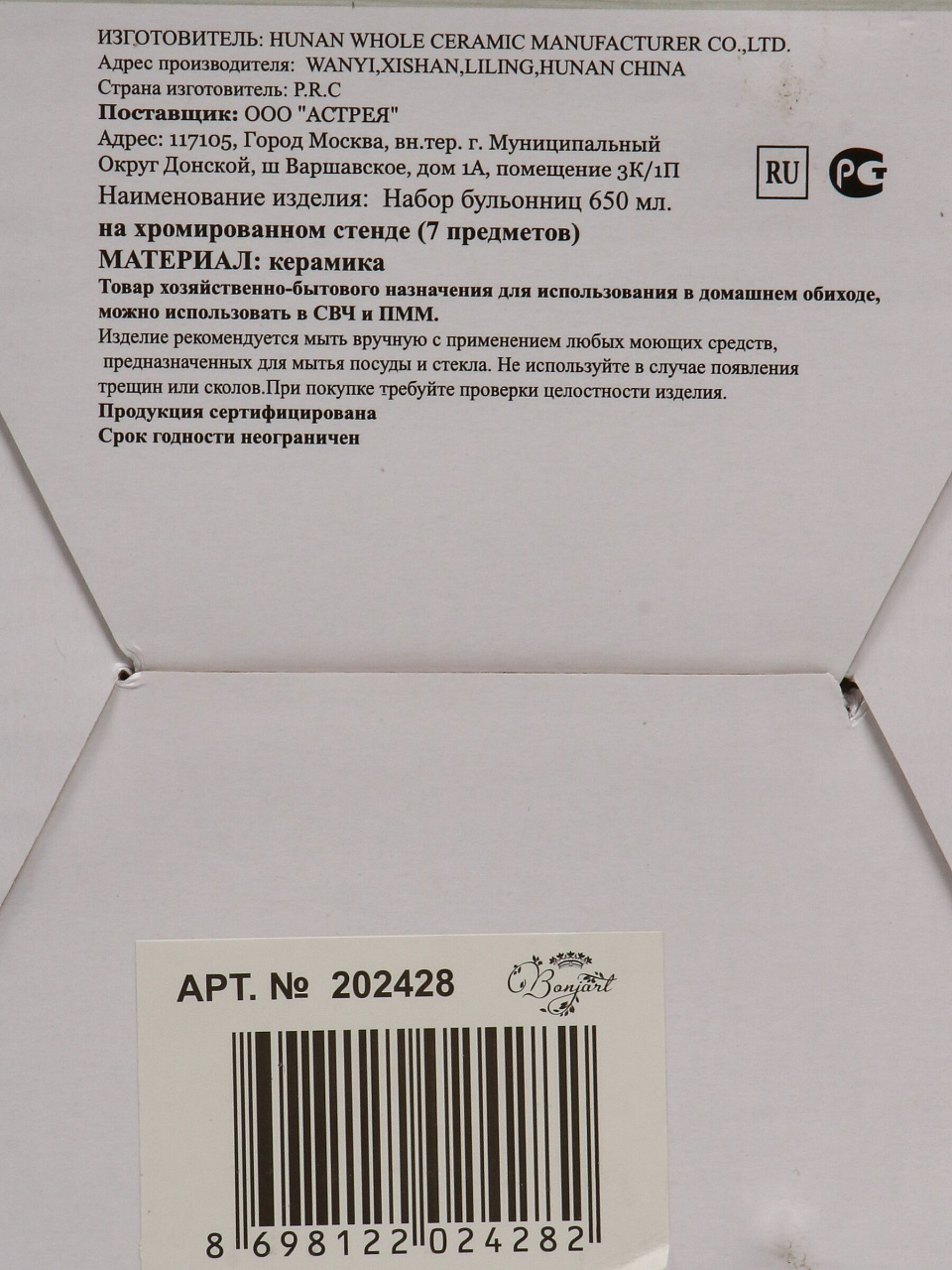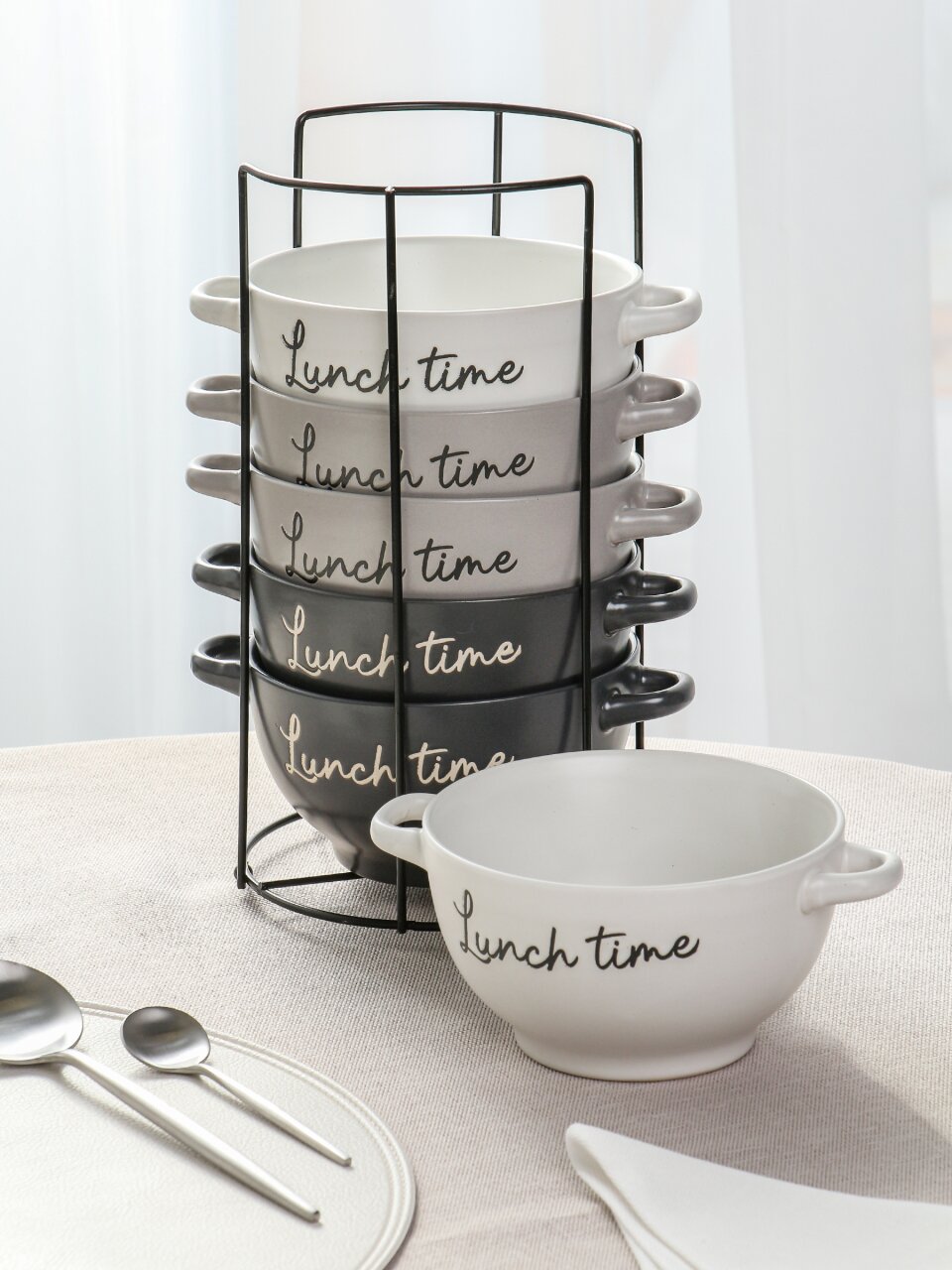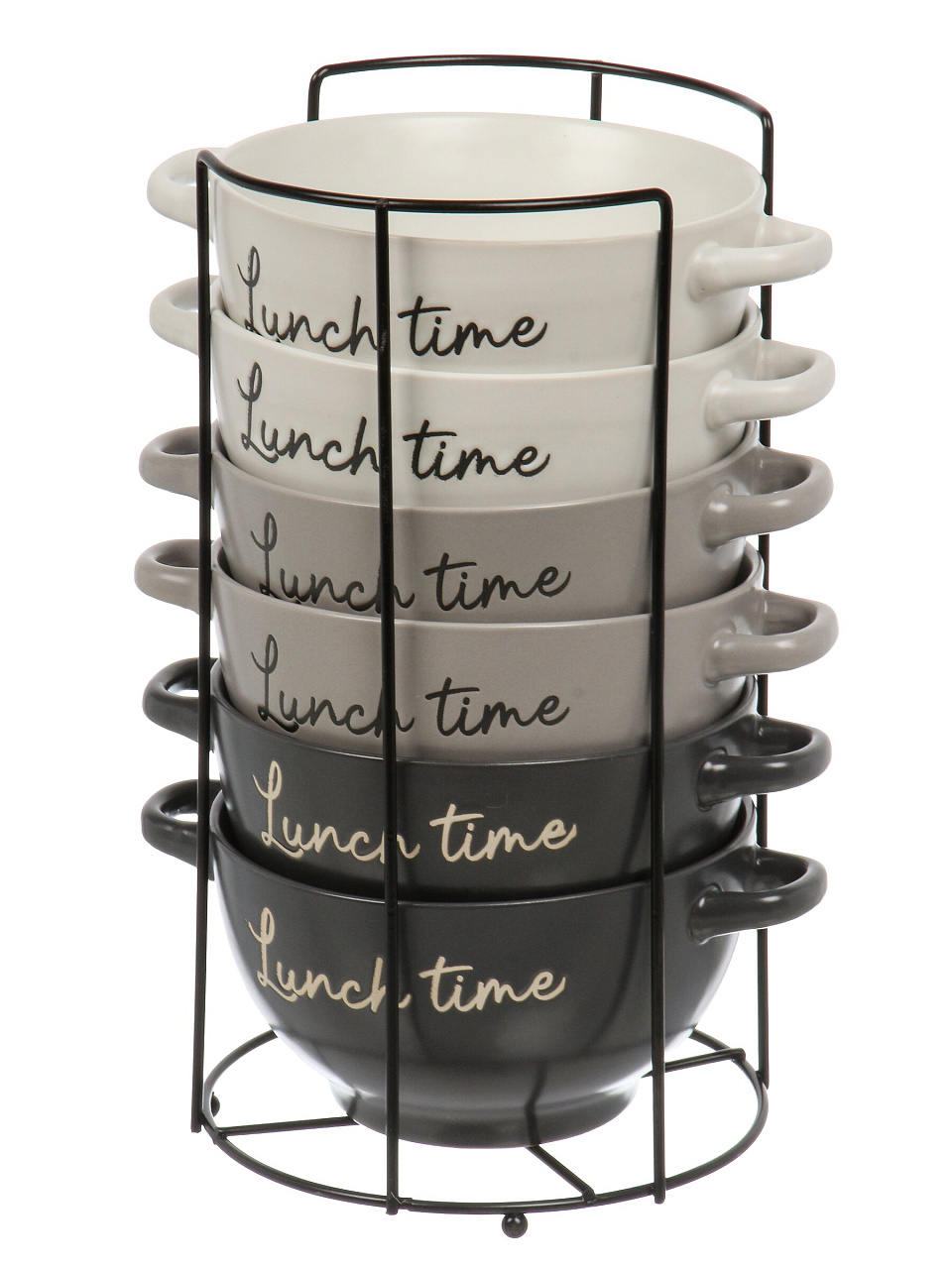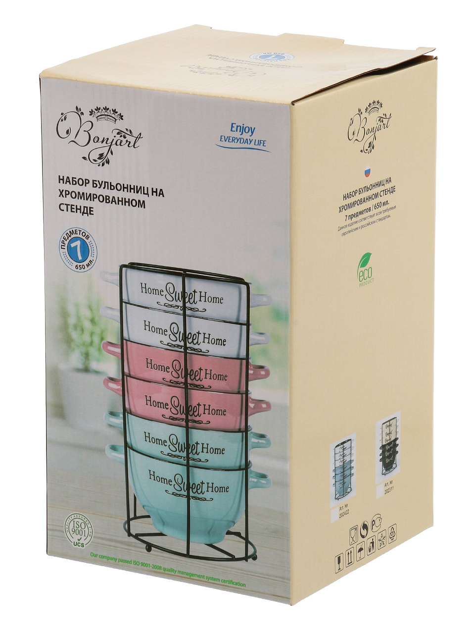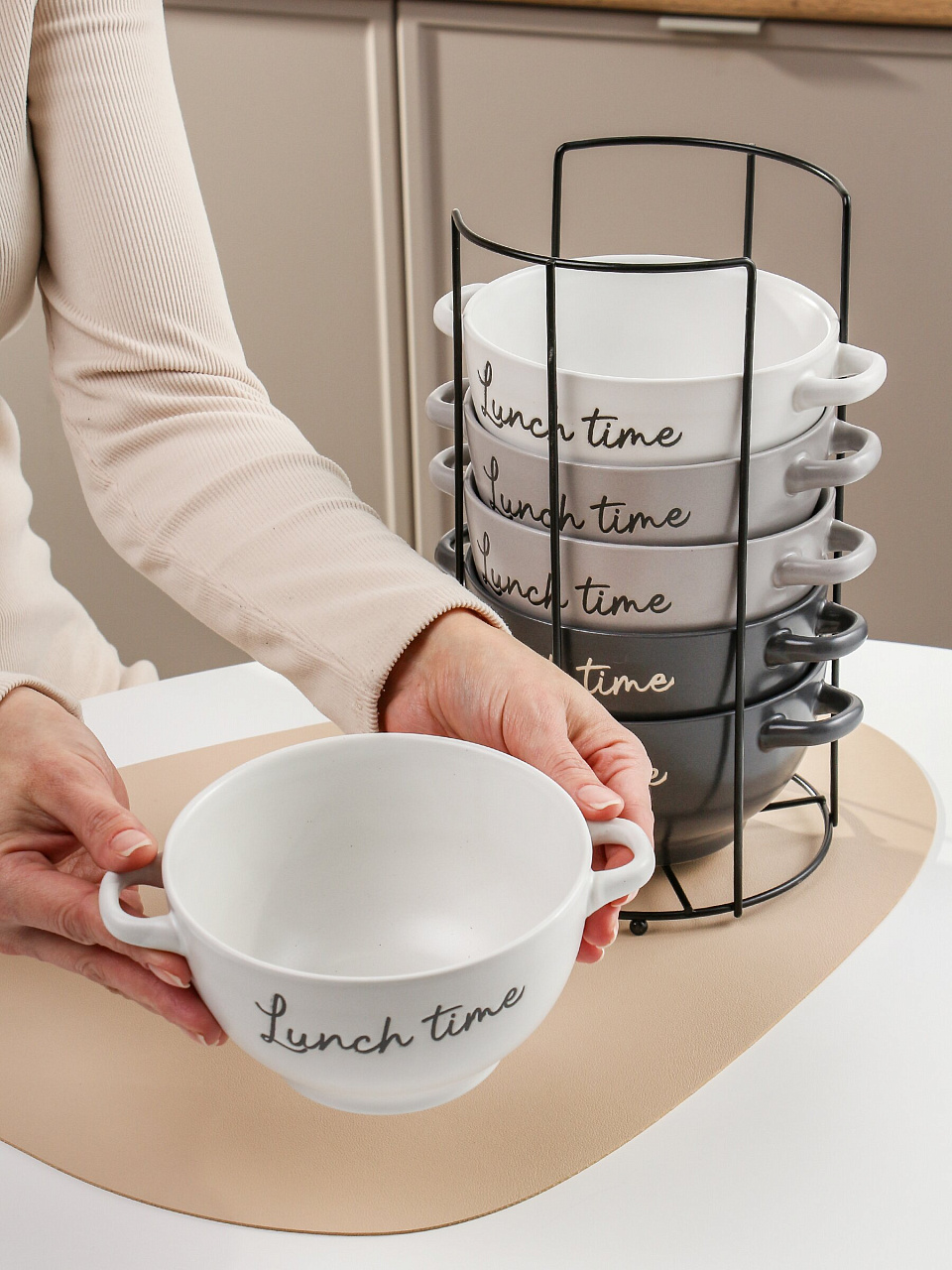 - Уникальный комплект: 6 керамических бульонниц с металлической подставкой для удобства хранения и подачи.