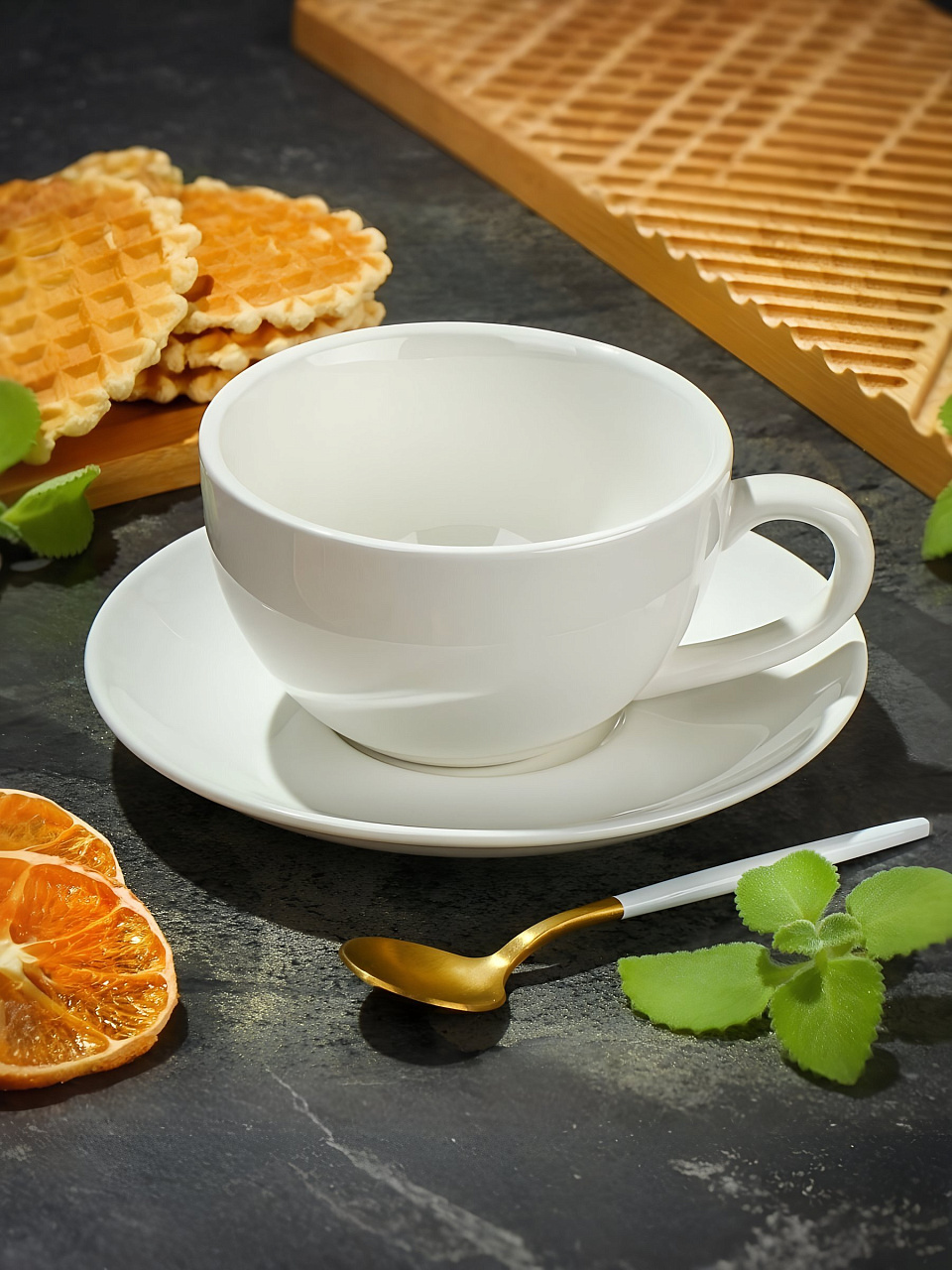Чайная пара поможет в полной мере погрузиться в атмосферу тепла, уюта и гармонии. Данный комплект станет прекрасным дополнением в вашей коллекции посуды. Неповторимый дизайн способен привнести изюминку в вашу чайную церемонию. Изделия с утонченными линиями хорошо подчеркивают вкус владельца. Данная модель изготовлена из качественного материала, который никак не повлияет на вкусовые качества вашего напитка. Кружка горячего чая согреет в плохую погоду, поднимет настроение, когда его нет, да и просто станет красивым украшением любого стола.