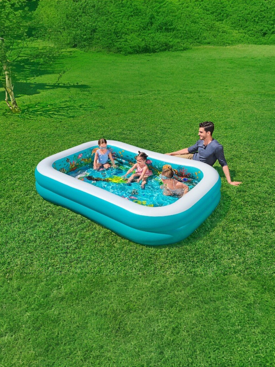 Бассейн изготовлен из прочного ПВХ, что гарантирует долговечность и надежность. Установка занимает всего 10 минут, а благодаря низкому бортику дети смогут легко входить и выходить из воды. В комплекте предусмотрены 2 пары 3D очков и 2 воздушных кольца, добавляющие элемент игры и развлечения.