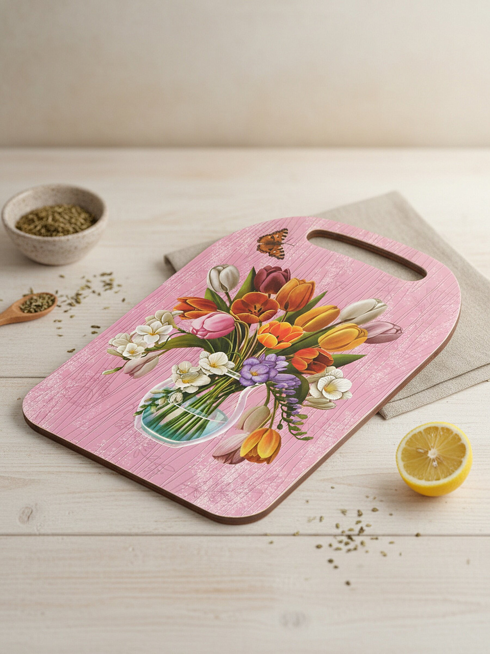 Многие спрашивают, подходит ли такая доска для сервировки или можно ли использовать её как подставку под горячее. Ответ — да: прочная древесина и стильный принт «Цветы в вазе» делают её универсальной для кухни и дачи. В отличие от стеклянных или пластиковых моделей, дерево не скользит, не царапается и сохраняет внешний вид даже при частом использовании. Как использовать разделочную доску с ручкой? Просто — удобно переносить нарезанные продукты или подавать закуски к столу.