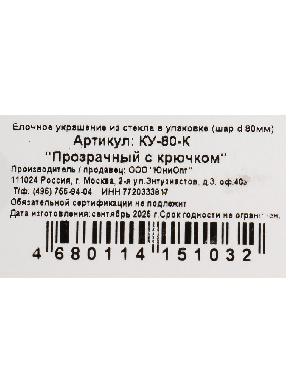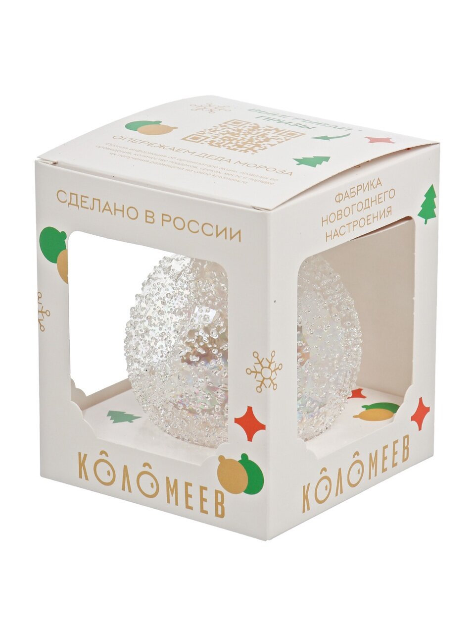 Шар оснащен надежным крючком для подвешивания и поставляется в индивидуальной коробке, что защищает его при хранении и транспортировке. Материал — стекло, диаметр — 8 см, цвет — прозрачный с блеском.