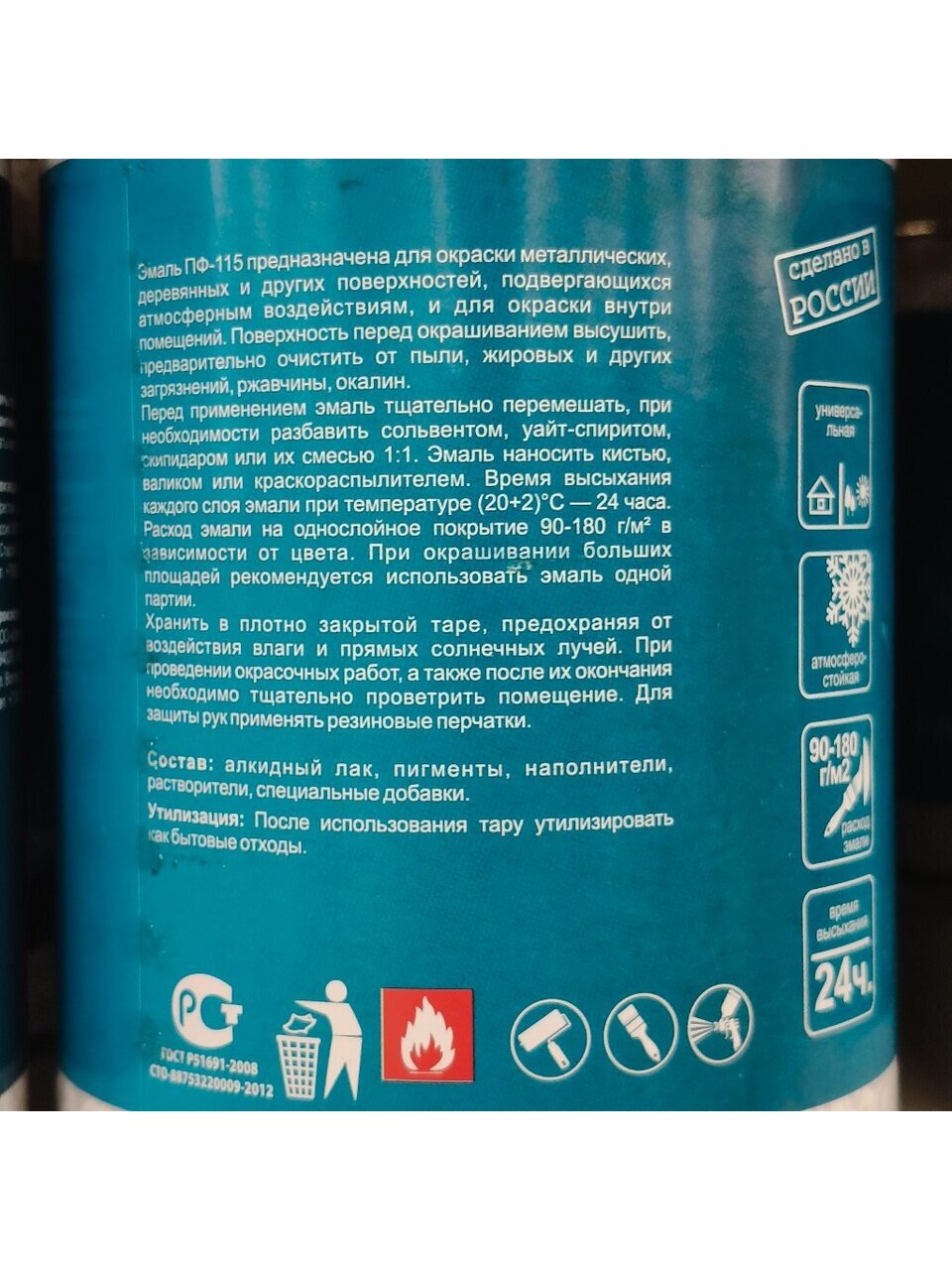 Эмаль ПФ-115 предназначена для окраски металлических, деревянных и других поверхностей, подвергающихся атмосферным воздействиям, и для окраски внутри помещений. Поверхность перед окрашиванием высушить, предварительно очистить от пыли, жировых и других загрязнений, ржавчины окалин.