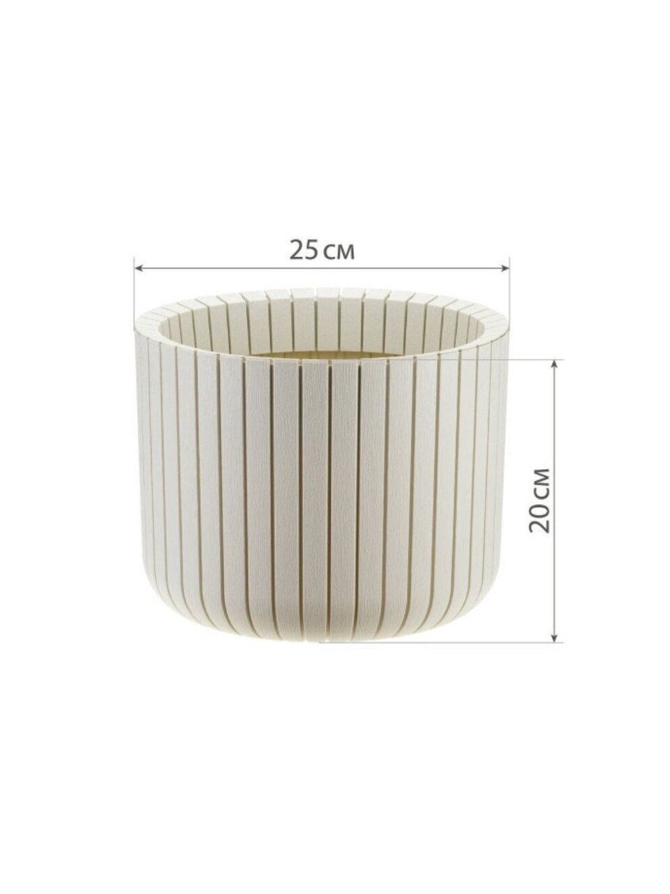 Изделие имеет цилиндрическую форму. Поверхность с имитацией дощечек и фактуры древесины, приятна на ощупь, отличается долговечностью и простотой в уходе. Кашпо Шато- привлекательная деталь, которая поможет воплотить Вашу интерьерную идею, создать неповторимую атмосферу в доме. Такое дополнение порадует глаз и подарит гармонию. Кашпо выглядит аккуратным компактным, не смотря на свою вместительность. Эффект объемных дощечек создается за счет декоративного ободка, при этом объем кашпо не уменьшается. Ободок также выполняет функцию ребра жесткости, что сохраняет прочность конструкции. Рекомендуемый размер вставки на 4-5 см уже размеров кашпо.
