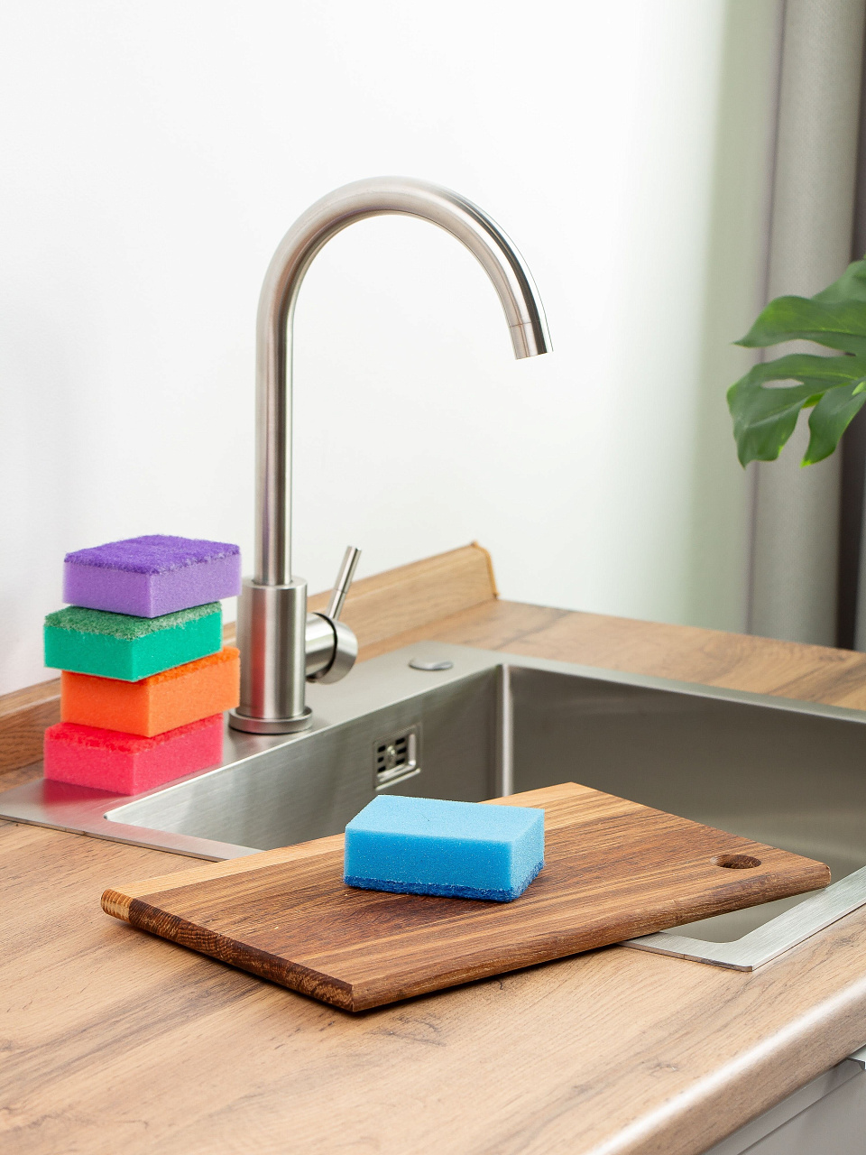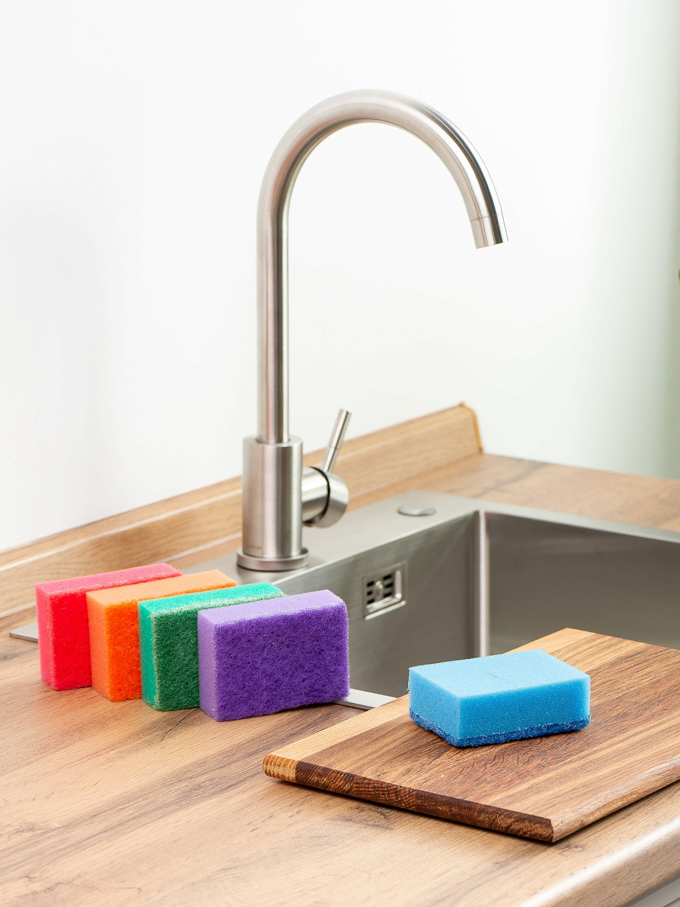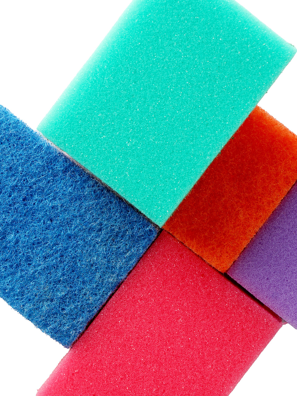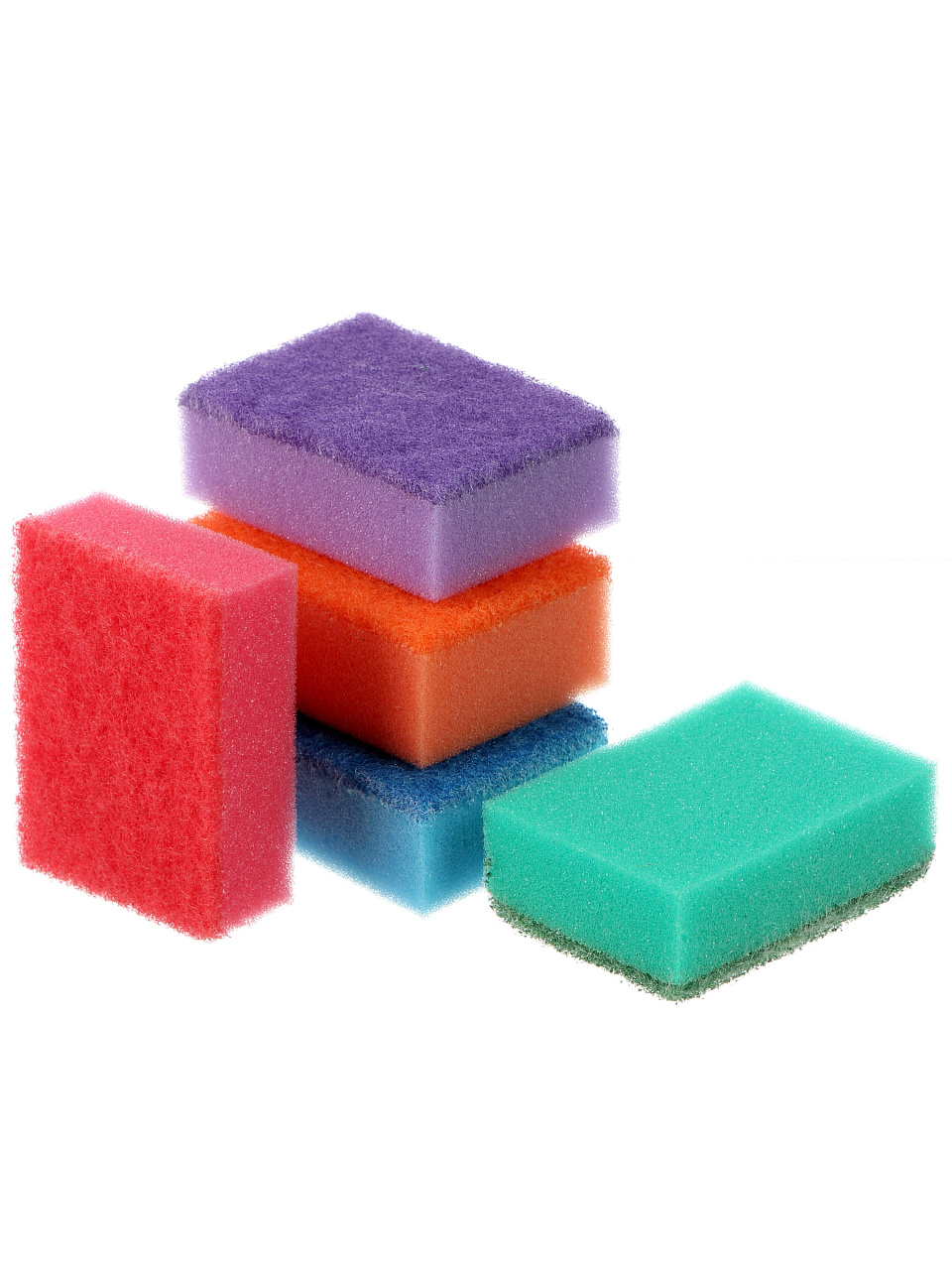 Не повреждает поверхности и не оставляет следов. В каждой упаковке по десять изделий из поролона пяти разных цветов и жесткого абразивного слоя зеленого цвета.