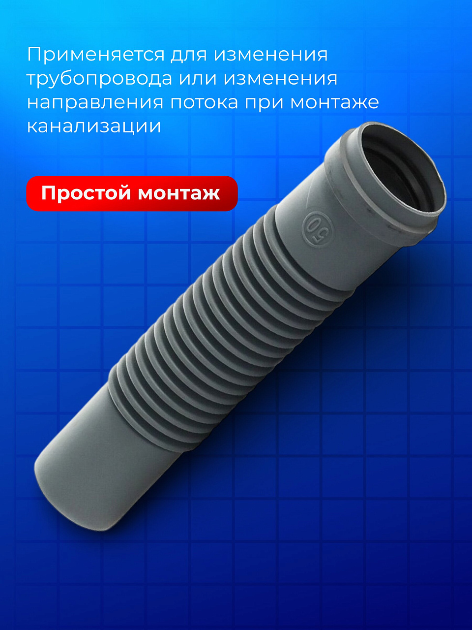Патрубок предназначен для изменения поворота трубопровода или изменения направления потока при монтаже систем канализации. Гибкий патрубок используется при повороте канализационных трубопроводов транспортирующих стоки внутри жилых, административных или промышленных зданий. Патрубок присоединяется к основной трубе при помощи канализационной муфты с гладкой стороны, и раструба.