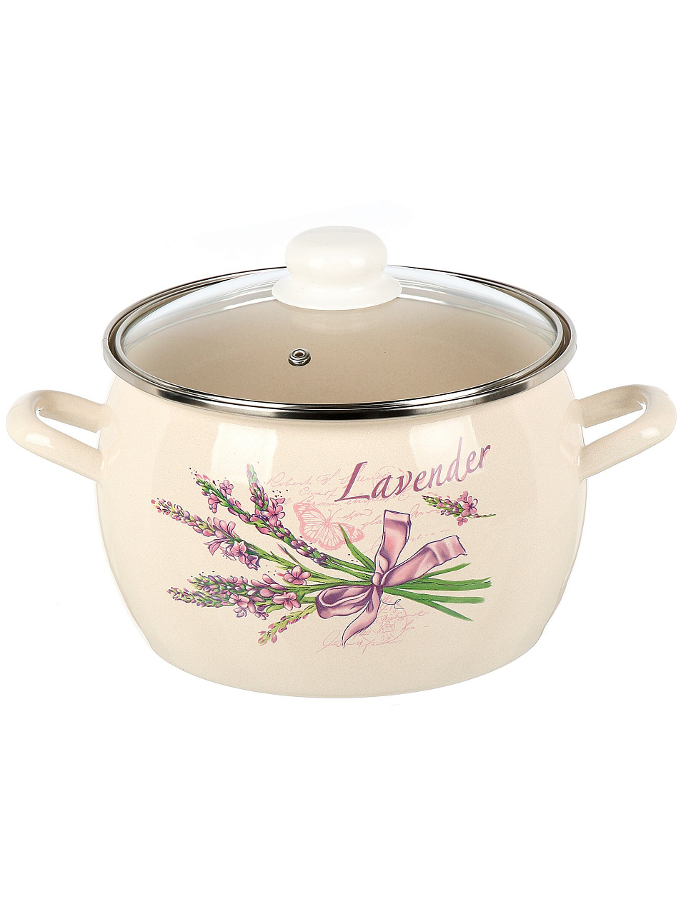 Кастрюля изготовлена из эмалированной стали, объём — 5 литров, форма — полусфера, крышка — жаропрочное стекло, внешний декор — Лаванда, артикул С-4216САП2/4Жм.