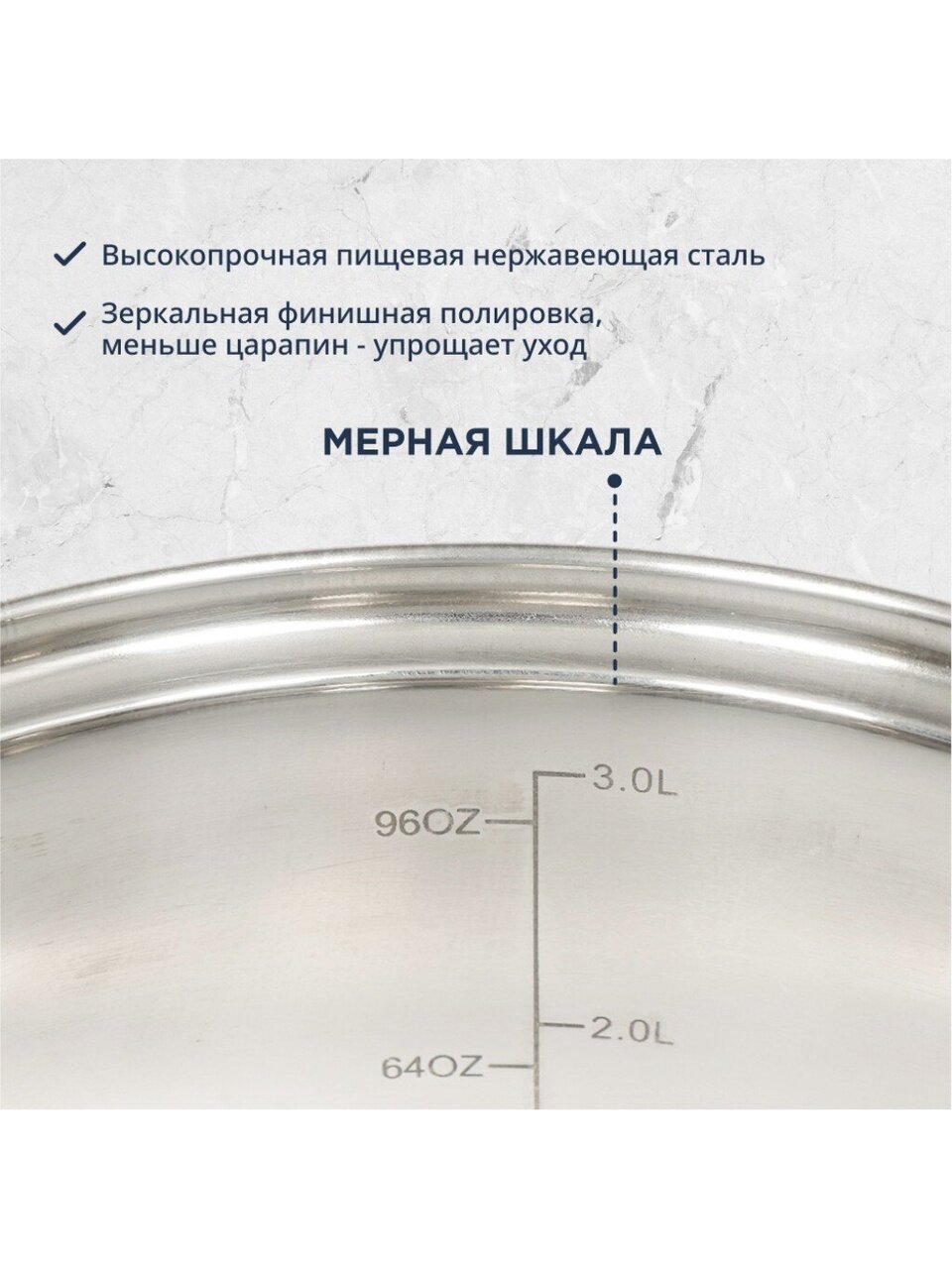 - Оптимальный объём 3.8 л, диаметр 20 см, долговечная нержавеющая сталь 201 марки — подходит для большинства кухонь