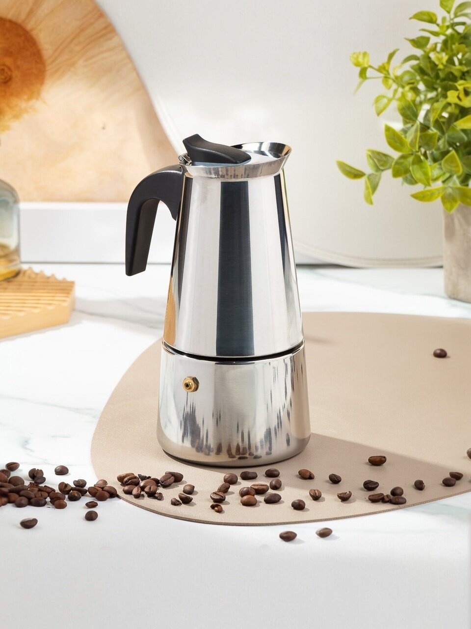 Гейзерная кофеварка изготовлена из нержавеющей стали, что гарантирует долговечность и надежность в использовании. Этот материал устойчив к коррозии и легко очищается, что делает уход за кофеваркой простым и удобным. Объем 0.3 литра позволяет приготовить несколько чашек кофе одновременно, что идеально подходит для утреннего ритуала или дружеской встречи.