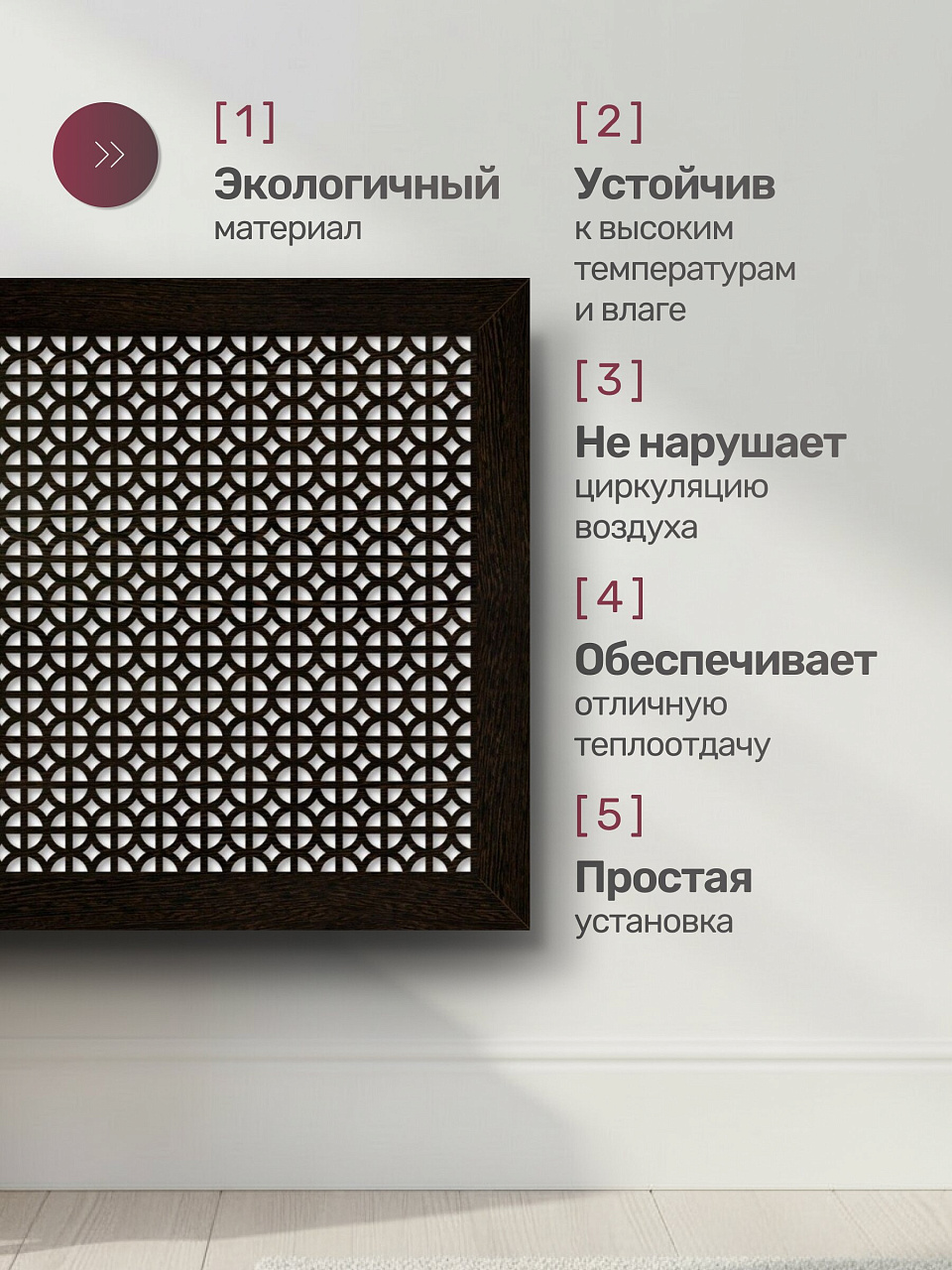 Экран для радиатора из МДФ 1200х600 мм венге DE LUXE — это практичное и эстетичное решение для маскировки батарей отопления. Благодаря стильному исполнению «Сусанна» от бренда «Стильный Дом» экран не только защищает радиатор от пыли, но и создает завершённый образ комнаты. Если вы ищете, какой экран выбрать для радиатора в гостиной или спальне, обратите внимание на этот вариант: МДФ устойчив к перепадам температуры и не деформируется со временем, а цвет венге DE LUXE добавляет современности.