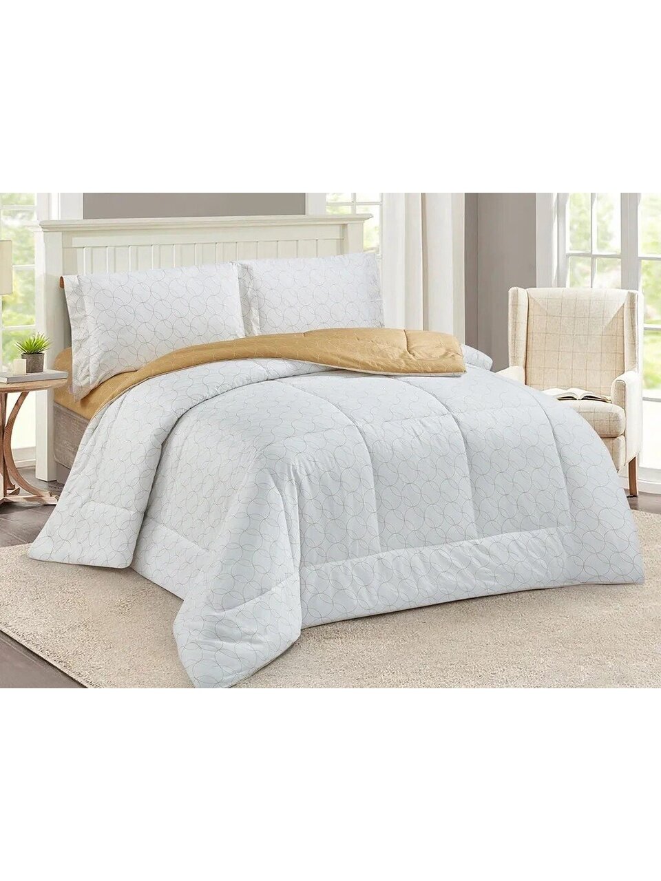 - В комплекте — всё для полноценного сна: пододеяльник, простыня, 2 наволочки и одеяло, премиум-сатин, подарочная упаковка