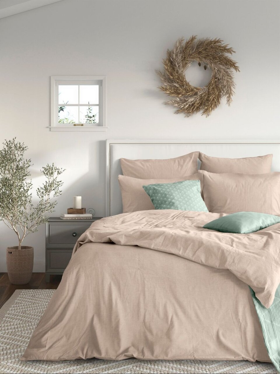 - Сатиновый комплект Verossa: премиальная гладкость, прочность и деликатный бежевый оттенок для современного интерьера