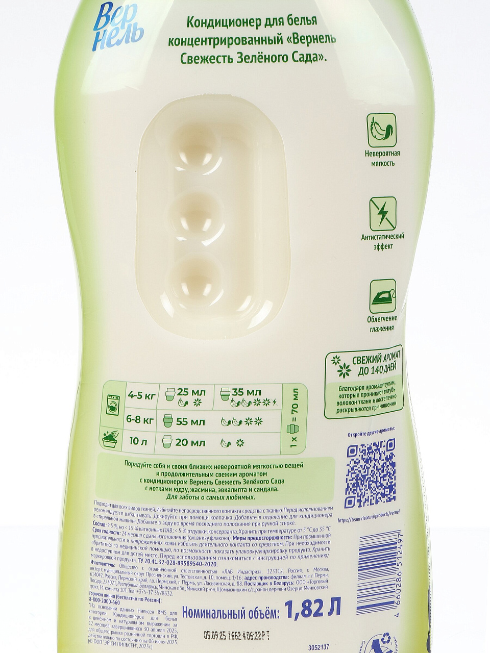 Свежесть зелёного сада на вашем белье: кондиционер Вернель 1.82 л — до 72 стирок, антисмятие, защита волокон, выгодная цена и экономия времени.