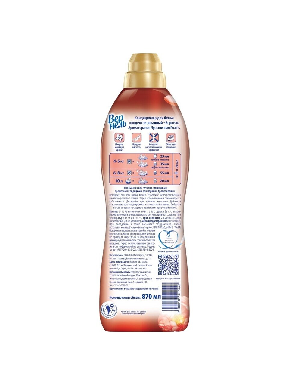 Концентрированный кондиционер для белья Вернель Ароматерапия Чувственная роза 870 мл (34 стирки) подарит Вашему белью не только невероятную мягкость, но и чувственный яркий аромат дикого гибискуса с нотами роз, а благодаря специальным аромакапсулам в составе кондиционер для стирки Вернель позволит наслаждаться интенсивным ароматом белья до 140 дней.