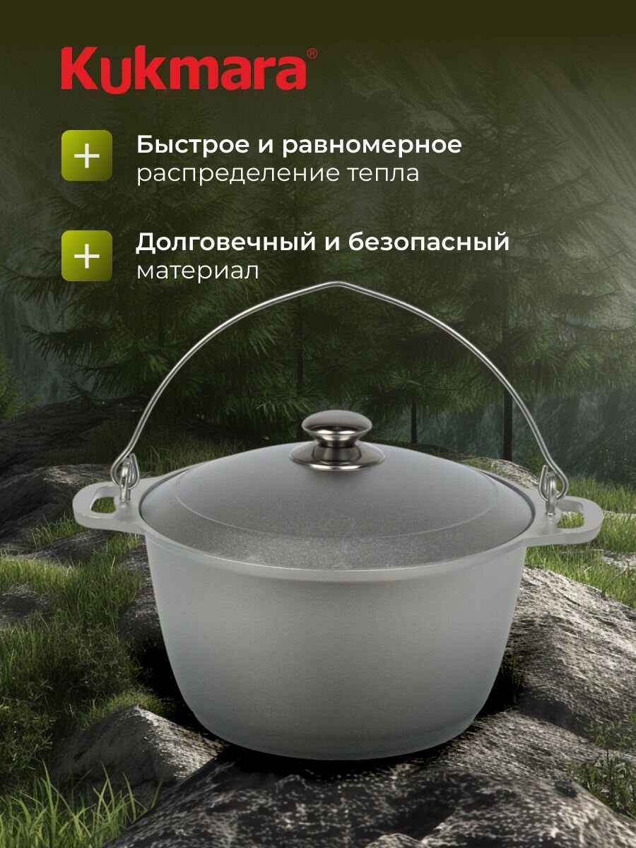 Походный котелок Kukmara из литого алюминия хорошо подходит для варки, тушения и томления, так как имеет отличные теплораспределительные и теплоаккумулирующие свойства, а блюда в нем получаются сочными и ароматными.