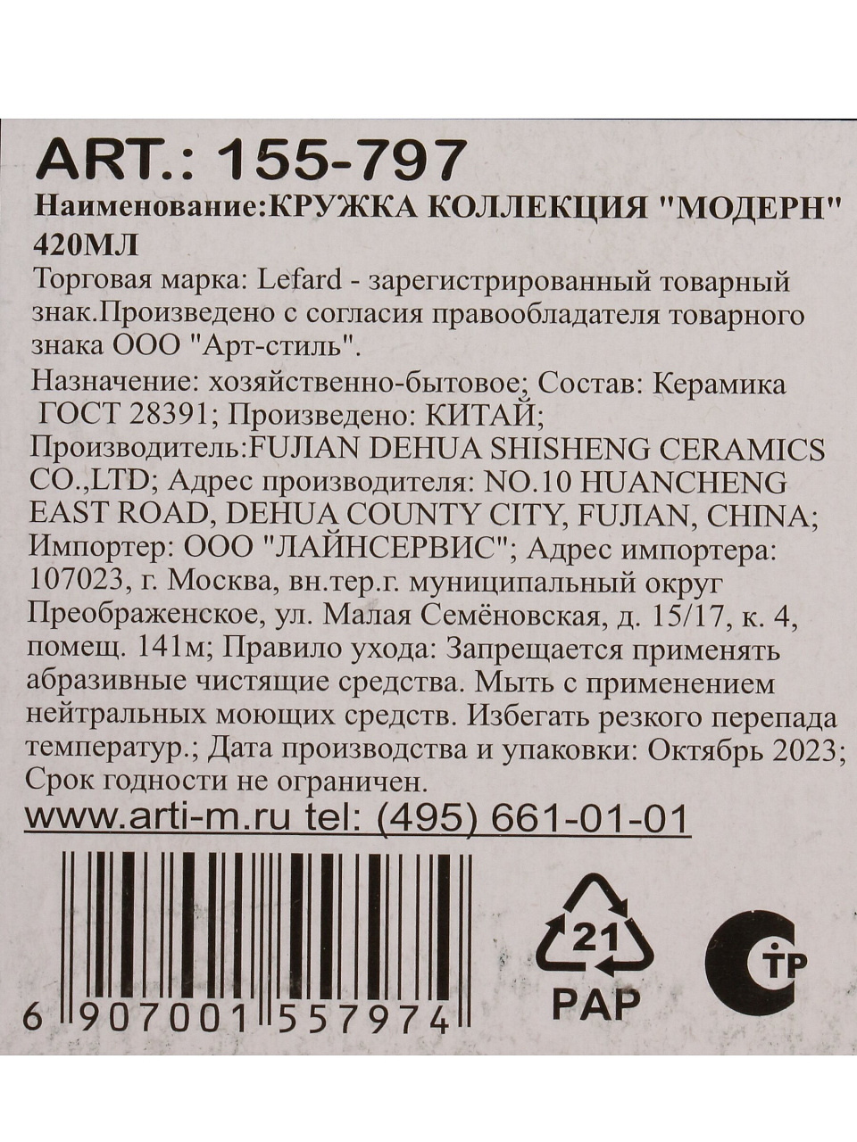 Вы можете приобрести «Кружка керамика, 420 мл, Модерн, Lefard, 155-797» и другие товары в нашем интернет-магазине в Твери по низким ценам и с бесплатным самовывозом.