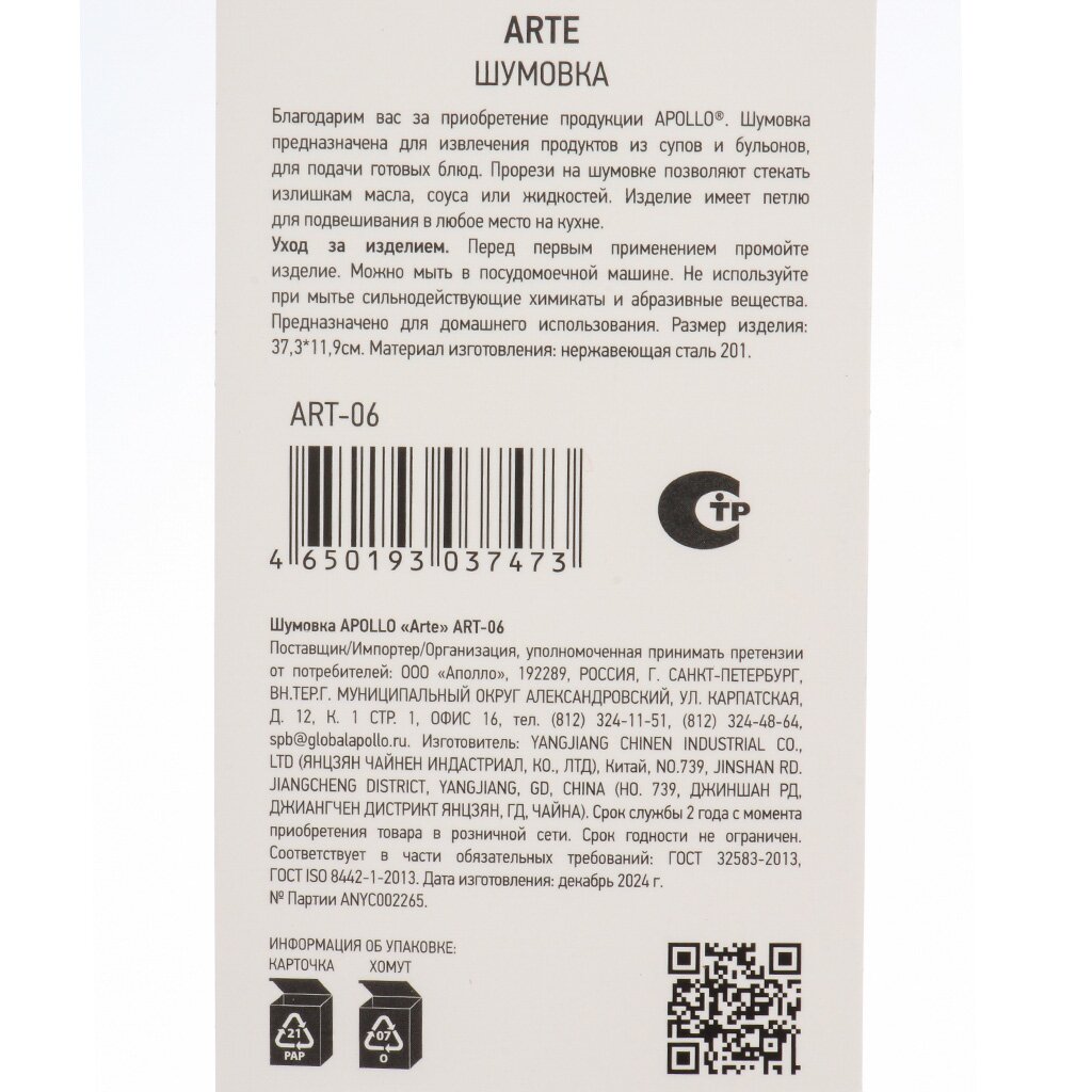 Шумовка из нержавеющей стали Apollo Arte ART-06 — идеальный выбор для современной кухни и стильного интерьера. Качественный кухонный инструмент станет незаменимым помощником для кулинарных экспериментов и ежедневного приготовления пищи. Благодаря универсальному дизайну и прочности материала, шумовка прекрасно справляется с задачами по снятию пены, процеживанию и работе с горячими блюдами. Серебристый цвет органично впишется в любую кухонную коллекцию, а профессиональный подход к деталям делает аксессуар не только функциональным, но и эстетически привлекательным.