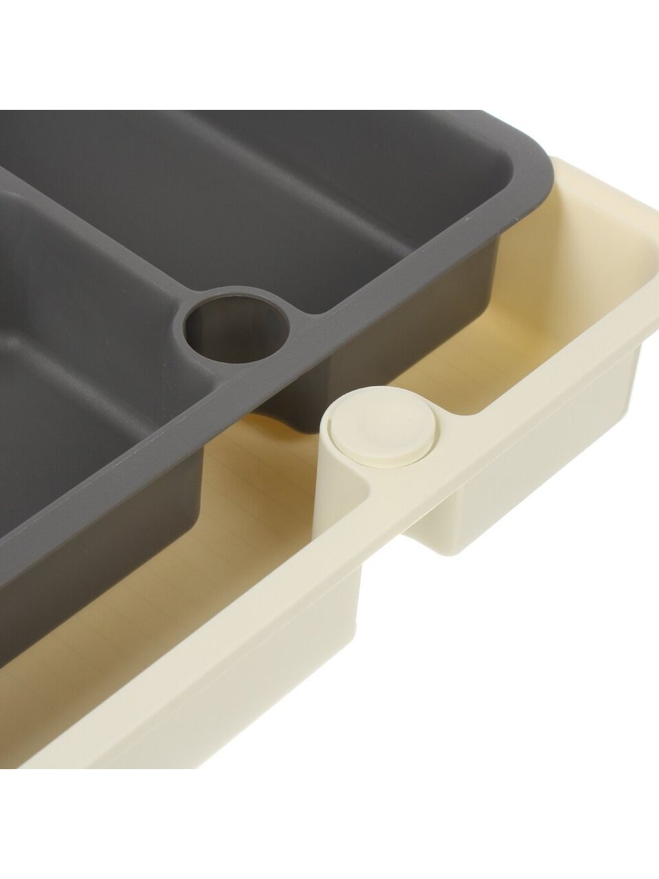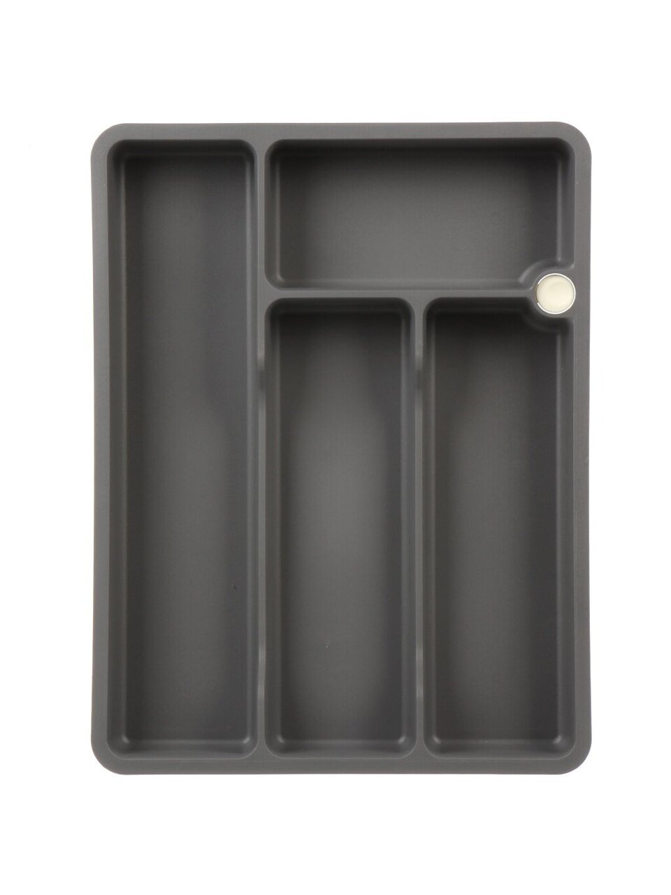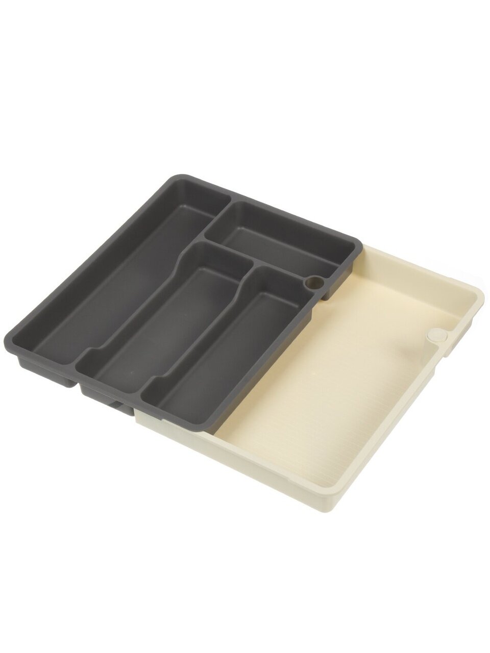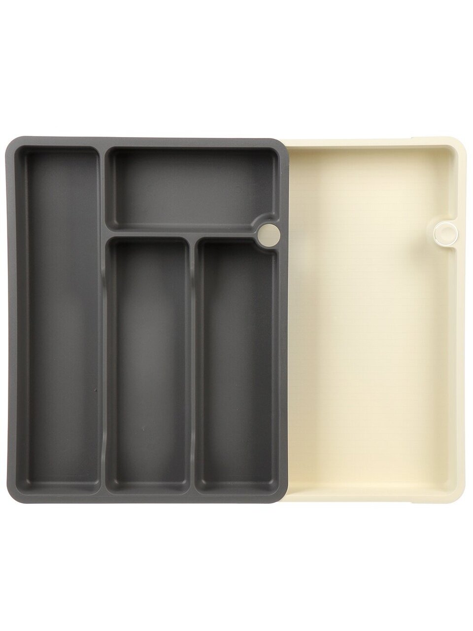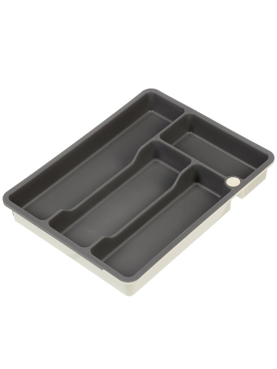 Четыре отделения разного размера и одно выдвижное отделение позволят удобно расположить столовые приборы, отделив их друг от друга. Лоток подходит для любых кухонных ящиков. Ширина лотка регулируется благодаря раздвижному механизму от 29 см до 49 см. Лоток выполнен из износостойкого пищевого пластика, устойчивого к царапинам, легко моется и не впитывает запахи. Можно мыть в посудомоечной машине.