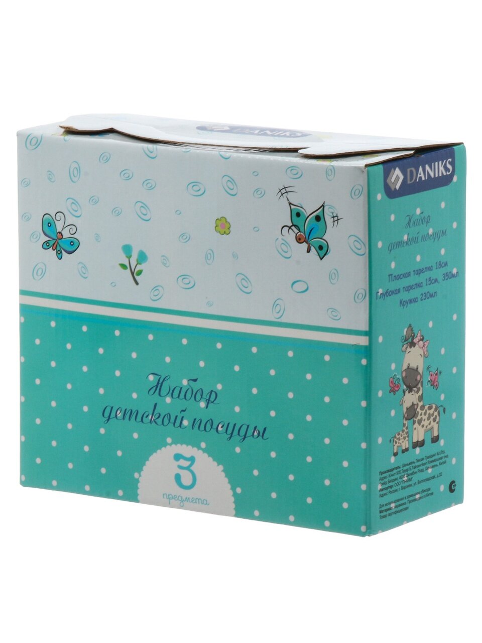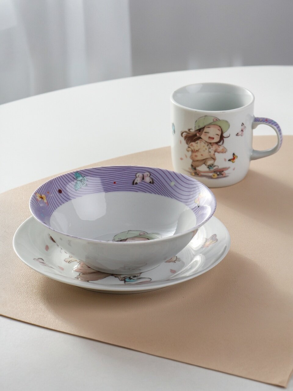 В набор входят: тарелка 17,5 см, салатник 15 см (350 мл), кружка 230 мл — оптимальные размеры для детского стола и ежедневного использования.