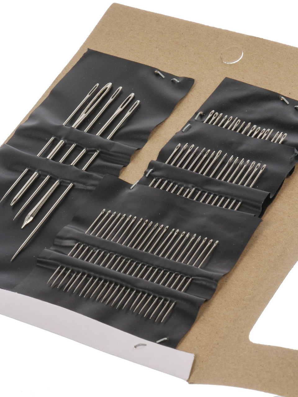 В наборе представлены иглы различных размеров и толщин, подходящие для ручного и машинного шитья, включая варианты для плотных и деликатных тканей.