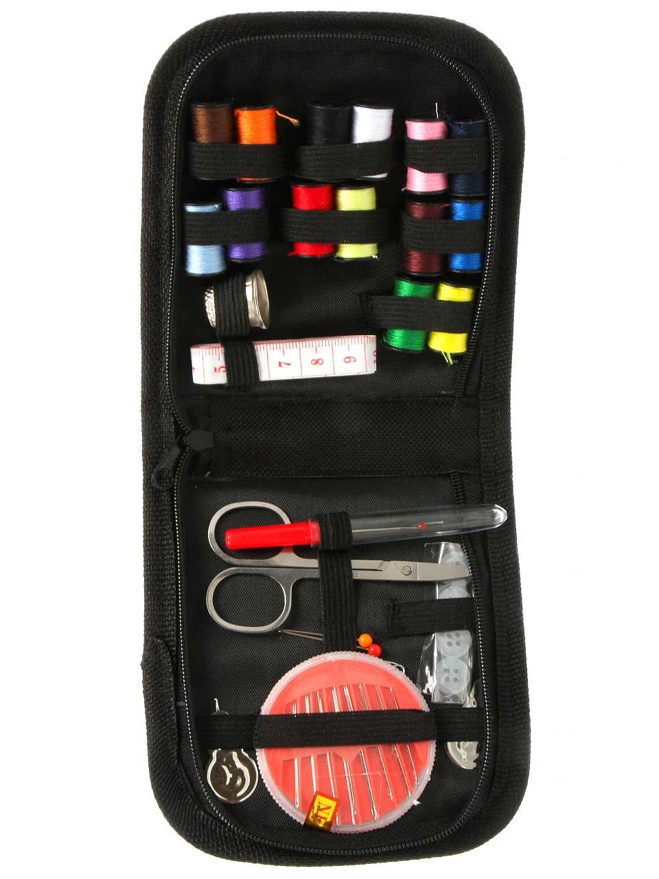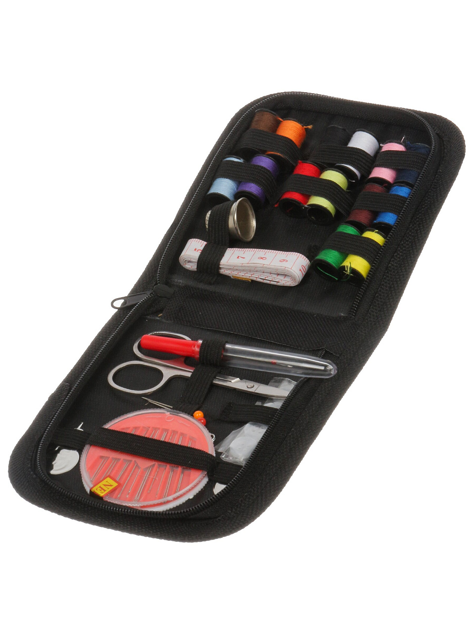 - 28 предметов: иглы, нитки, ножницы, напёрсток и другие аксессуары для разных видов ремонта и шитья.