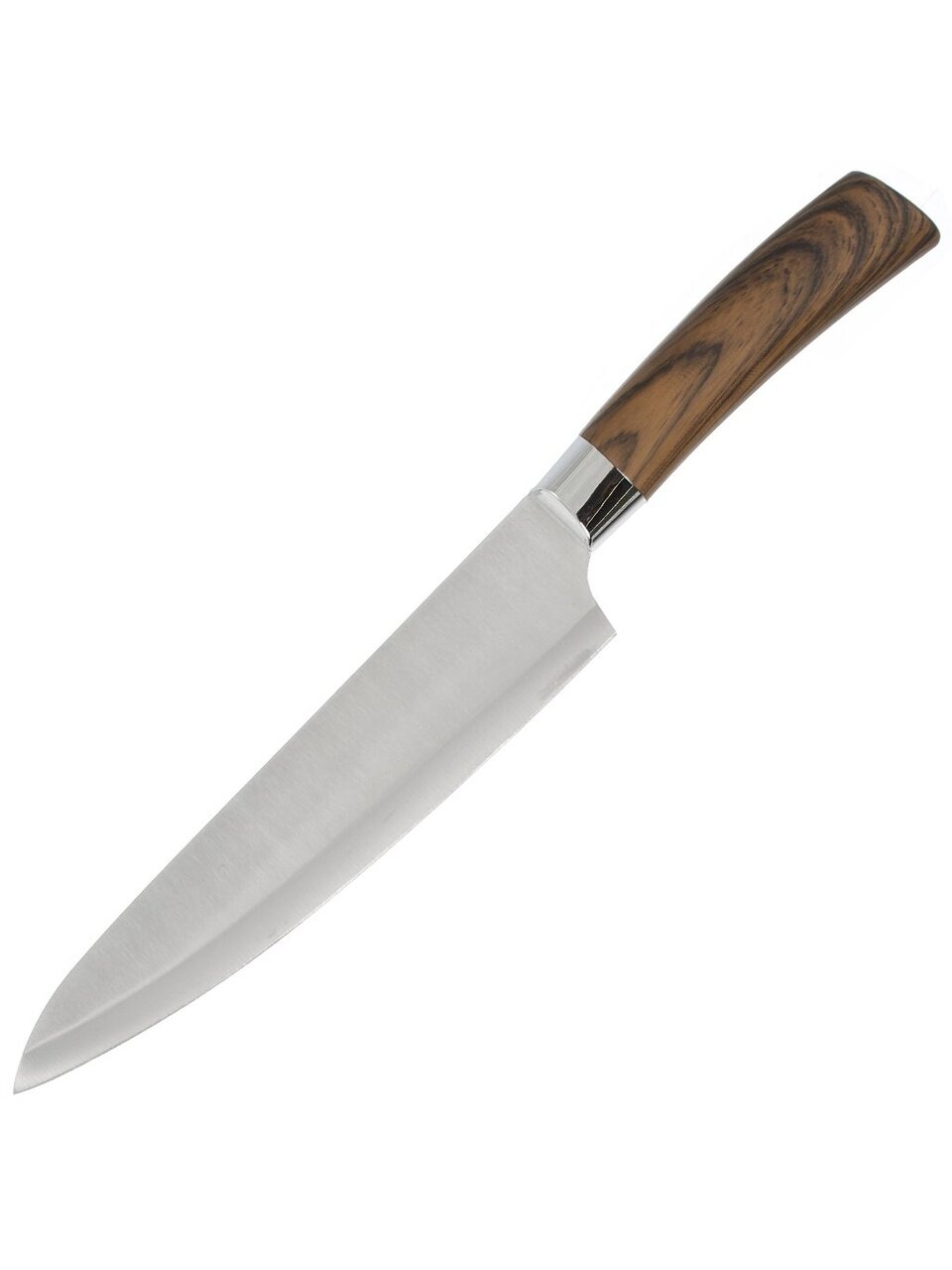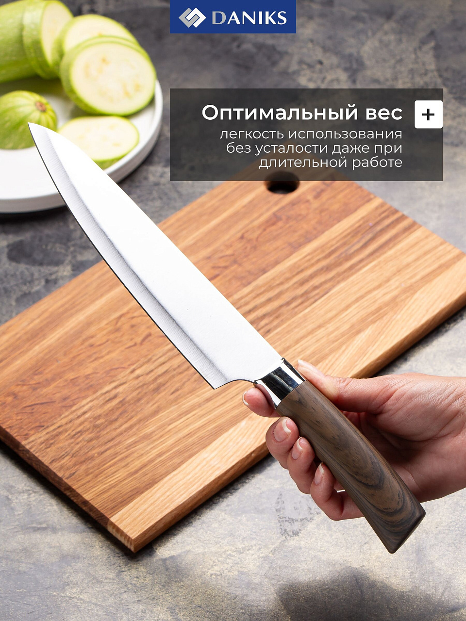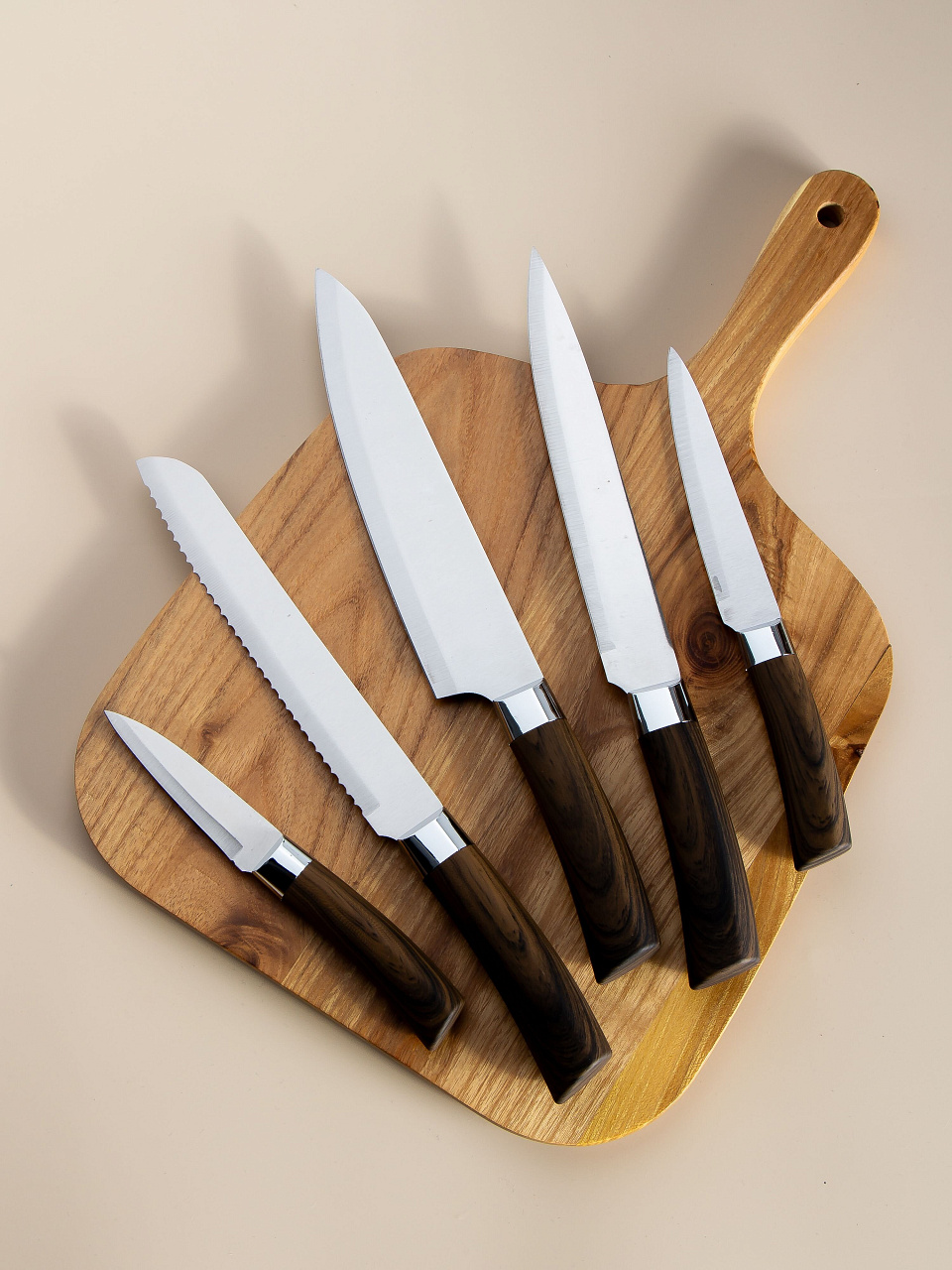 - универсальная комплектация: шеф-нож, нож для овощей, универсальный нож, хлебный нож, разделочный нож;
