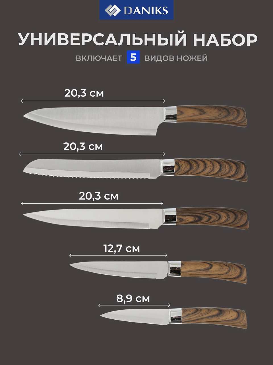 Ищете стильные и надежные ножи для кухни? Набор ножей 5 предметов Daniks Style Y4-8915 станет отличным выбором для создания кулинарных шедевров. Современный дизайн, коричневая эргономичная рукоятка и прочная нержавеющая сталь делают этот комплект незаменимым помощником на кухне. Практичность и универсальность набора позволяют с легкостью справляться с любыми задачами: от нарезки овощей до разделки мяса и хлеба. Благодаря компактной упаковке на блистере комплект удобно хранить или брать с собой на дачу.