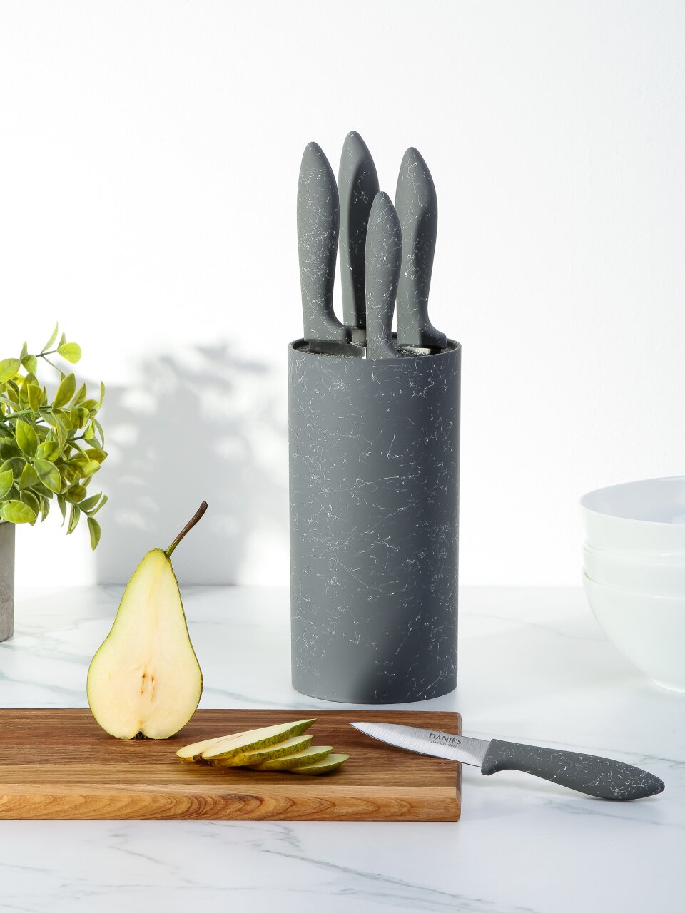 - Универсальный комплект: 5 ножей и подставка для всех задач на кухне.