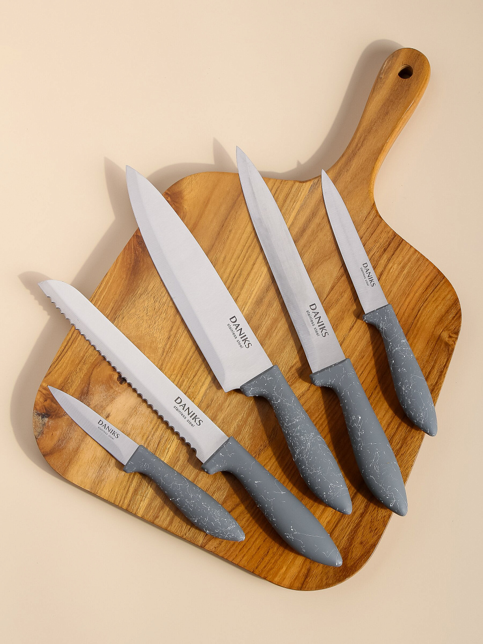 Набор ножей Daniks Гранит W-A371 — это продуманный комплект из 5 ножей и подставки, который закрывает все базовые потребности современной кухни. В комплект входят шеф-нож, разделочный, для овощей, универсальный и хлебный нож — оптимальный набор для нарезки, чистки и разделки продуктов. Лезвия изготовлены из прочной нержавеющей стали, устойчивой к коррозии и потере остроты, что особенно важно при ежедневном использовании и мытье в посудомоечной машине.