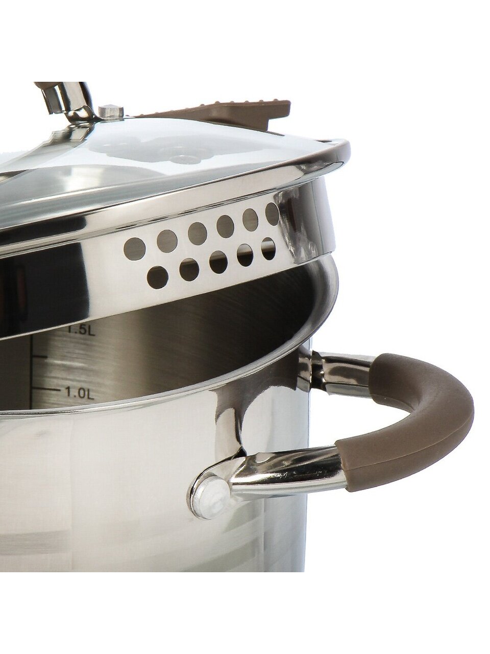 В комплекте три кастрюли: 2.1, 2.9 и 3.9 л, каждая с отдельной стеклянной крышкой. Материал корпуса — нержавеющая сталь, толщина дна 3 мм, цвет — серый.