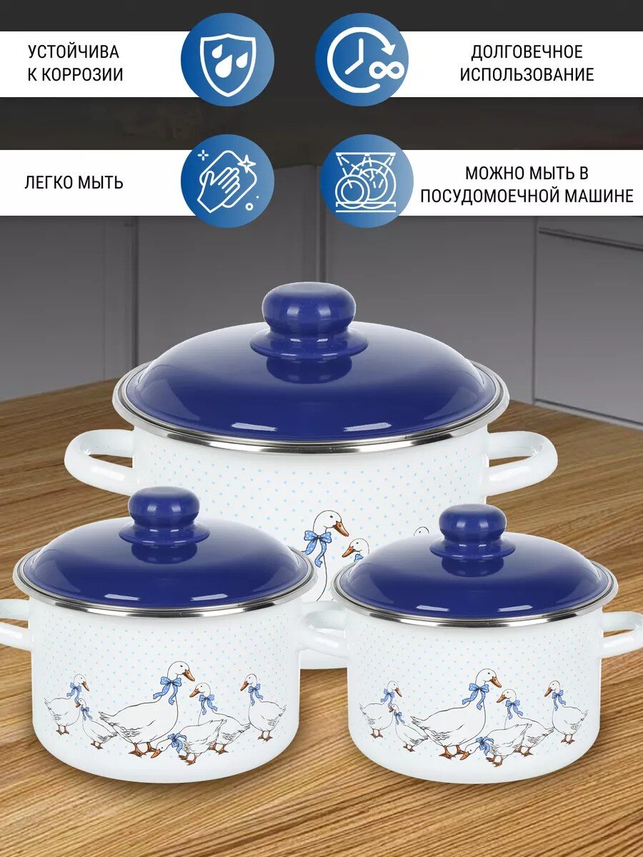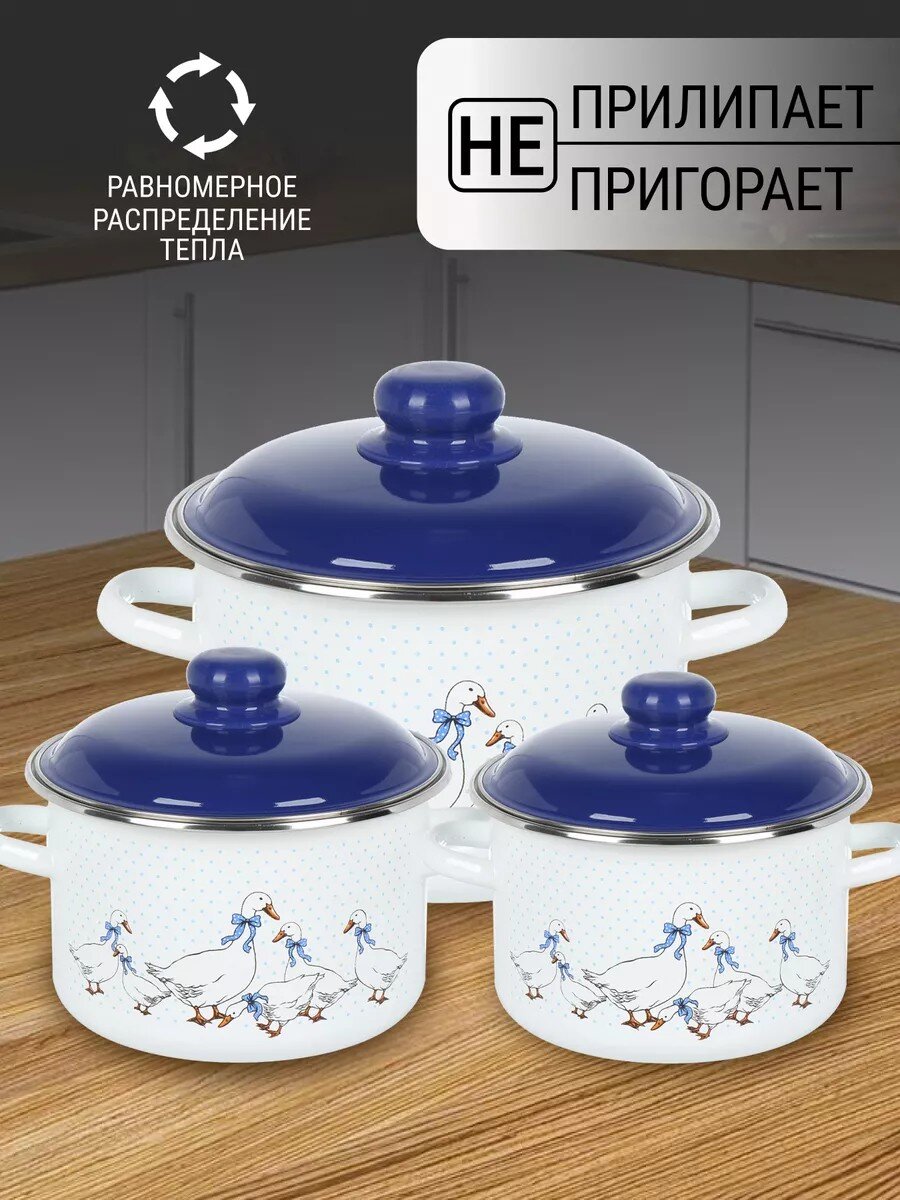 Закажите набор посуды «Гуси» и получите выгодную цену на комплект из трёх кастрюль с доставкой. Оцените долговечность, безопасность и универсальность эмалированной стали от российского бренда СтальЭмаль.