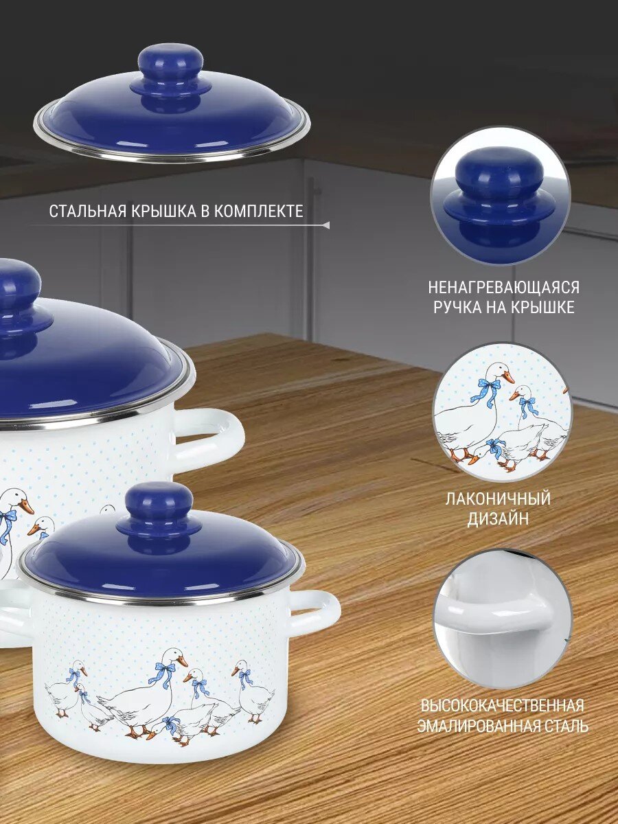 В наборе три кастрюли объёмом 2, 3 и 5,5 литра, каждая с отдельной крышкой. Материал — эмалированная сталь, цвет белый, бренд СтальЭмаль, серия «Гуси», артикул 6KB191M.