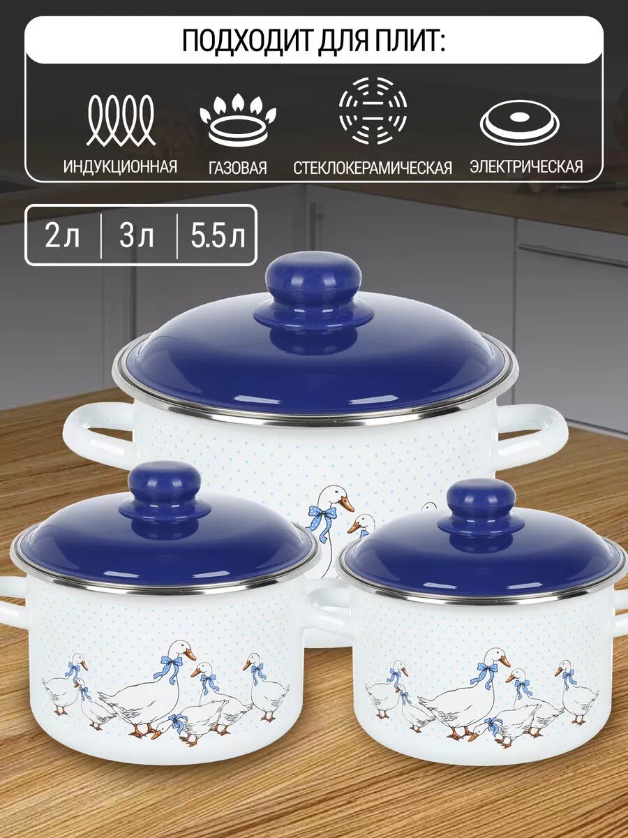 Набор эмалированных кастрюль 3 шт. (2, 3, 5,5 л) для индукции: долговечность, стиль и универсальность — идеальный выбор для дома и дачи