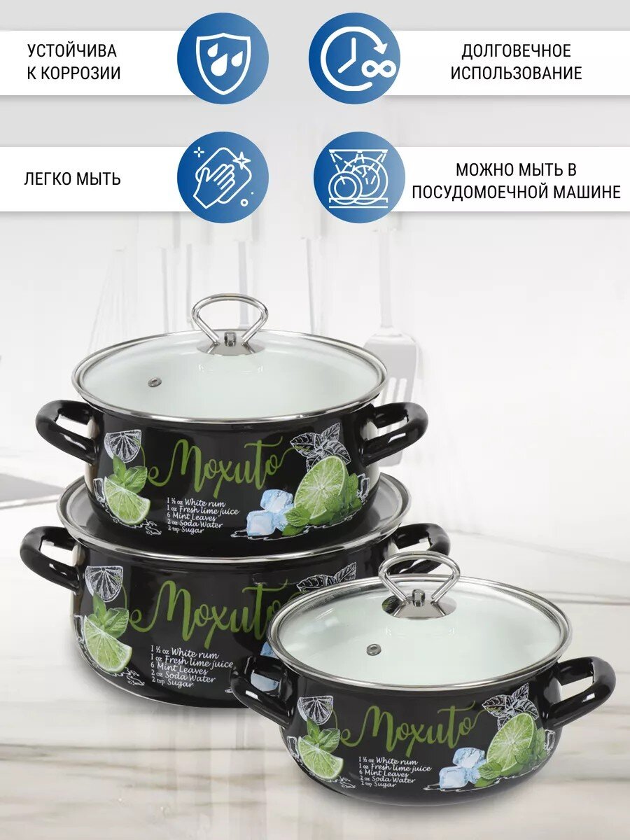 Набор эмалированной посуды 6 предметов Мохито-1 Экстра Стиль — универсальное решение для кухни: 3 объёма, долговечная сталь, стильный черный дизайн