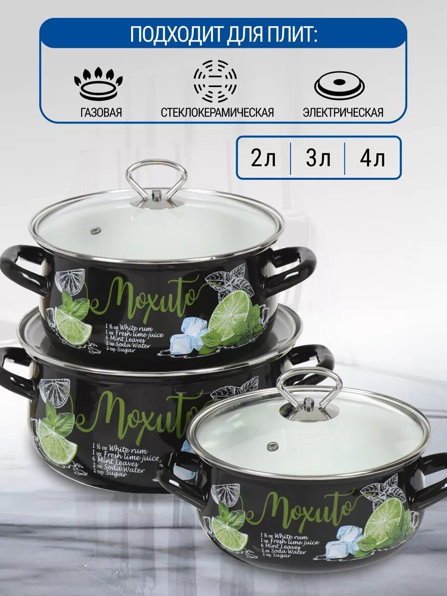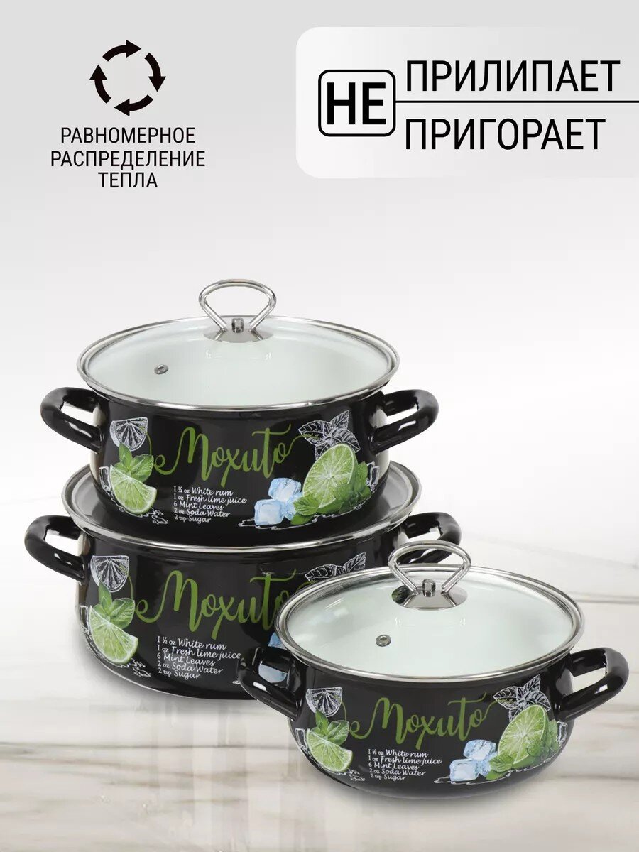 Набор кастрюль из эмалированной стали Керченский металлургический завод Мохито-1 Экстра Стиль — это сочетание долговечности, безопасности и эстетики. Если вы ищете, какую посуду выбрать для ежедневного приготовления, обратите внимание на эмалированную сталь: она не взаимодействует с продуктами, легко моется, не впитывает запахи. В наборе три кастрюли разного объёма (2, 3, 4 литра) с прозрачными крышками — удобно следить за процессом готовки.