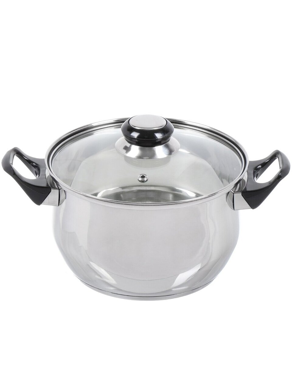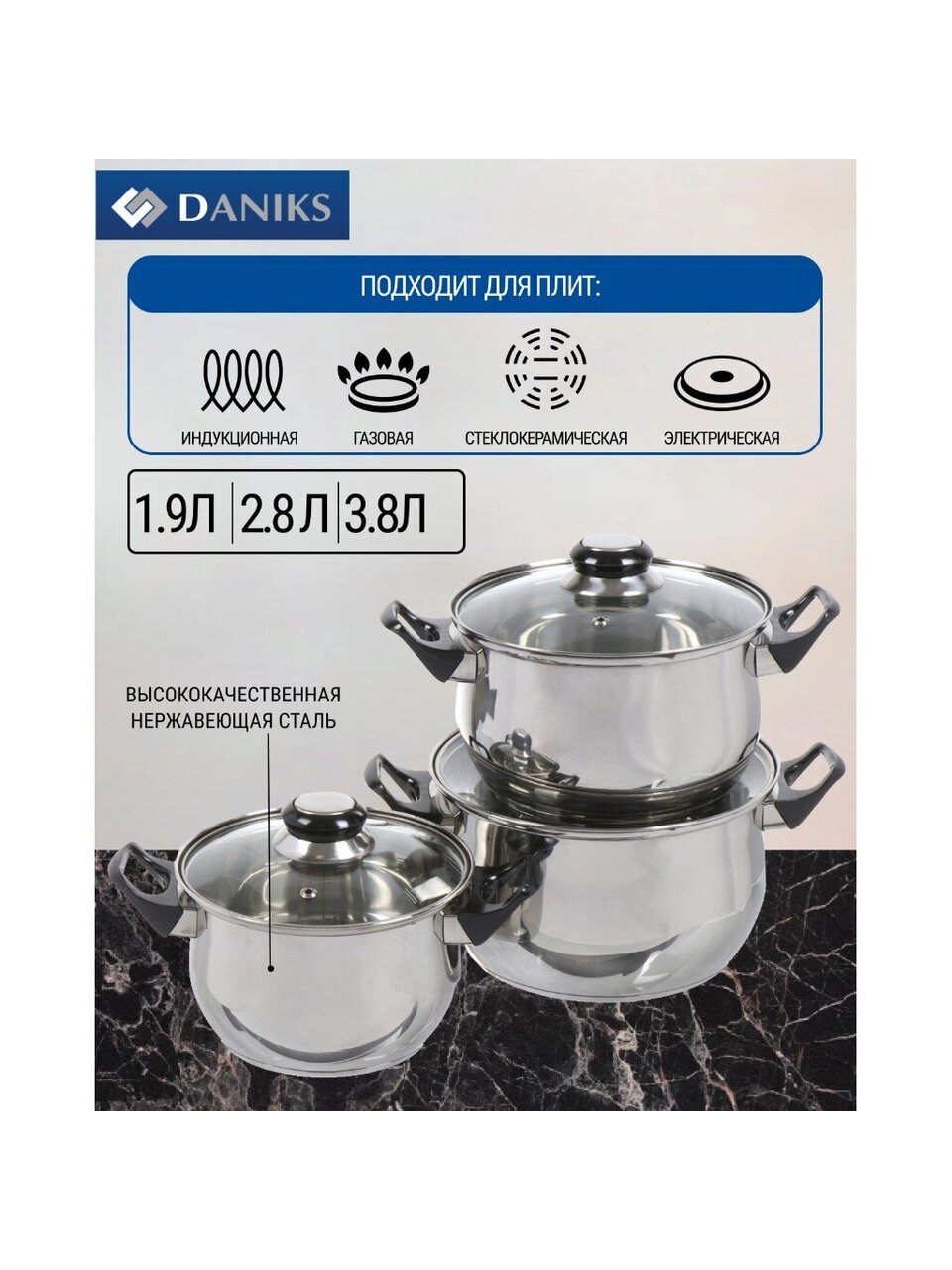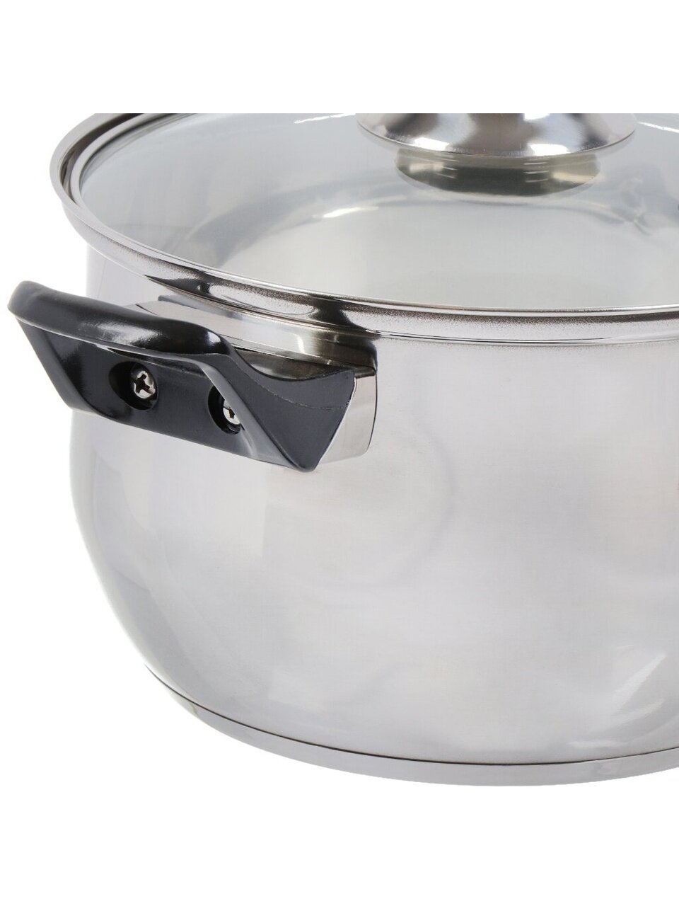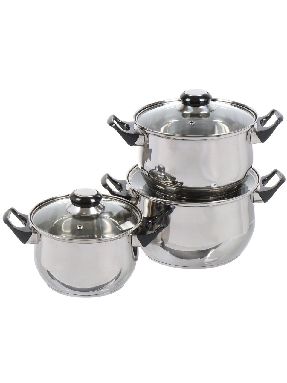 Набор посуды из нержавеющей стали 6 предметов: оптимальный выбор для дома и дачи. Три кастрюли 1,9/2,8/3,8 л, стеклянные крышки, выгодная цена.
