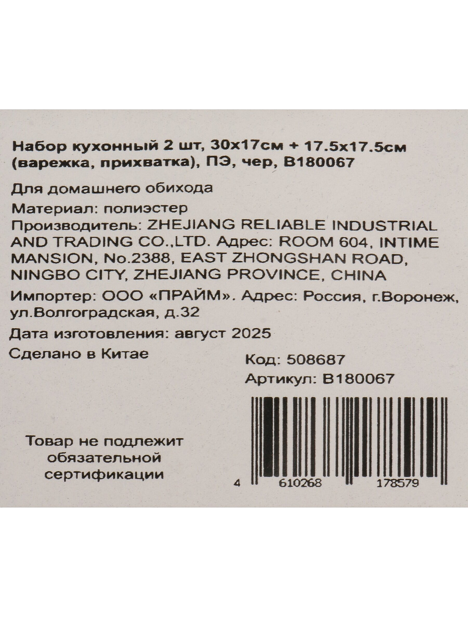 Вы можете приобрести «Набор кухонный 2 шт, варежка 30х17 см, прихватка 17.5х17.5 см, 100% полиэстер, черный, B180067» и другие товары в нашем интернет-магазине в Белгороде по низким ценам и с бесплатным самовывозом.
