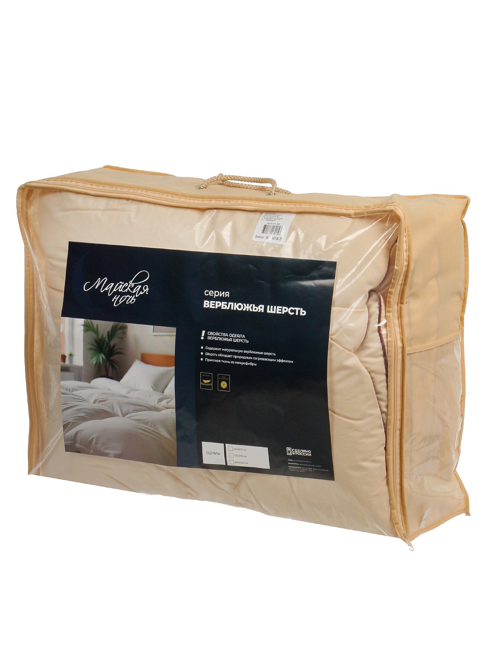 Размер 172х205 см (двуспальное), плотность 400 г/м2, зимнее, чехол — 100% полиэстер, цвет бежевый, стёганое, с окантовкой, наполнитель — верблюжья шерсть и полиэстер.