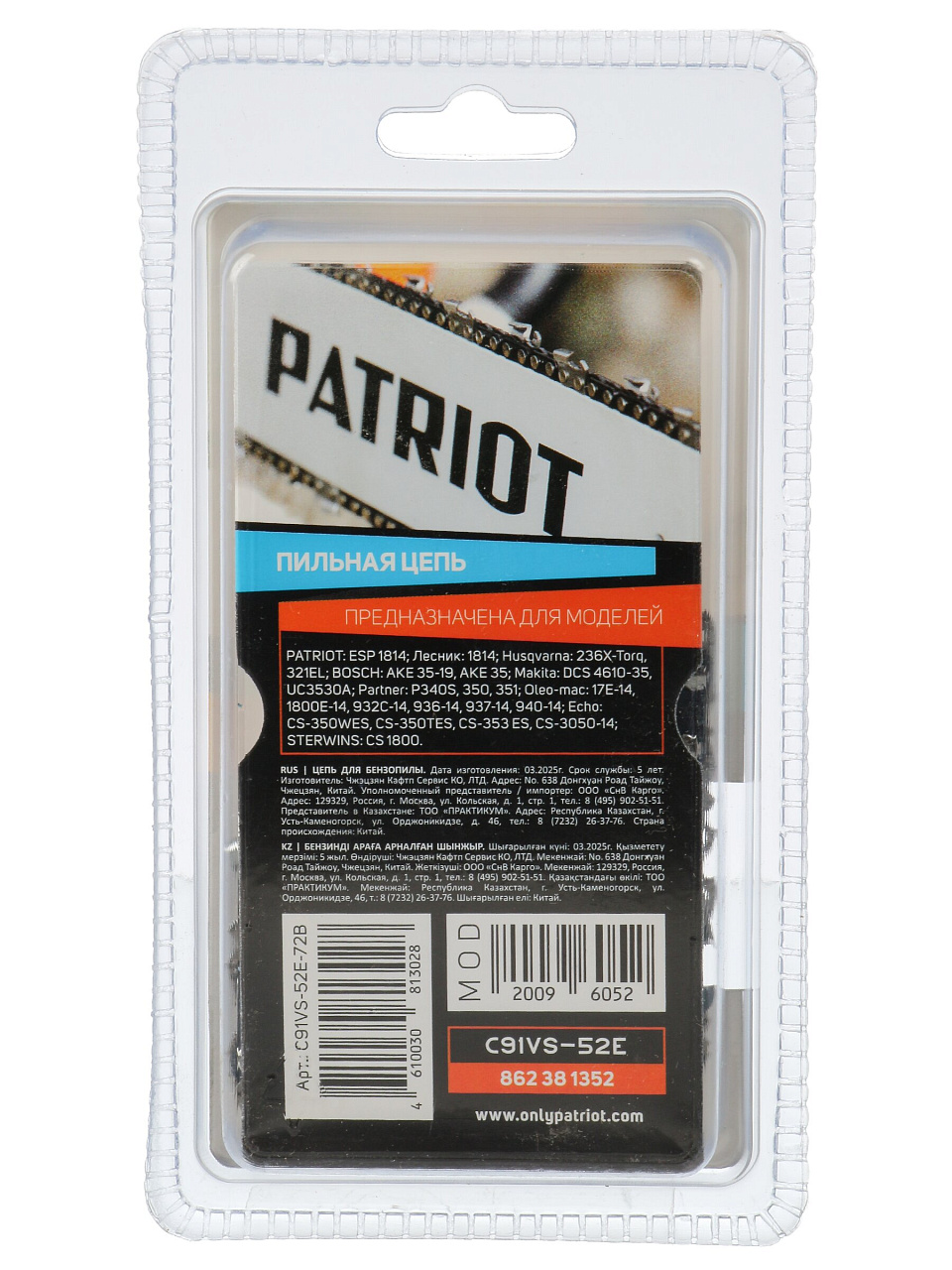 Вы можете приобрести «Цепь пильная Patriot, 91VS-52E, шаг цепи 3/8 '', 1.3 мм, 52 звена , 35 см (14"), 862381352» и другие товары в нашем интернет-магазине в Серпухове по низким ценам и с бесплатным самовывозом.