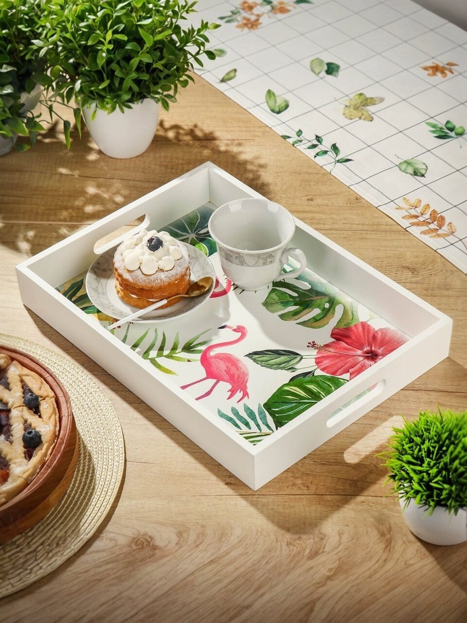 Поднос - это функциональный и стильный аксессуар для сервировки стола и стилизации домашнего пространства. Подносы можно использовать в качестве подставки под горячее, - они не боятся высоких температур. Во избежание сокращения срока службы и ухудшения внешнего вида не рекомендуется мыть изделия из дерева в посудомоечной машине, оставлять надолго в воде, а также пересушивать. После мытья необходимо протереть и дать высохнуть.