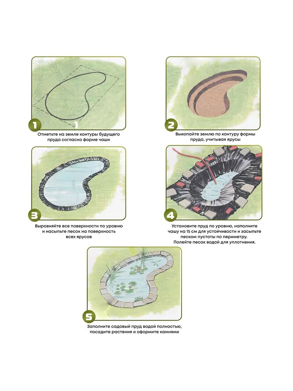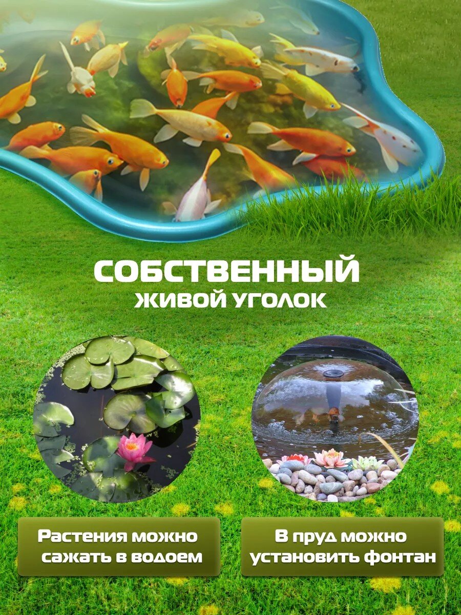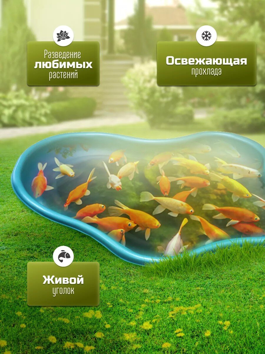 Пластиковый материал не подвержен коррозии, не требует сложного обслуживания и легко очищается. Компактные размеры — длина 145 см, ширина 110 см, глубина 50 см — позволяют разместить пруд даже на небольшом участке, при этом он выглядит солидно и привлекательно. Средний размер идеально подходит для большинства приусадебных территорий, а также для оформления зоны отдыха рядом с домом или беседкой.