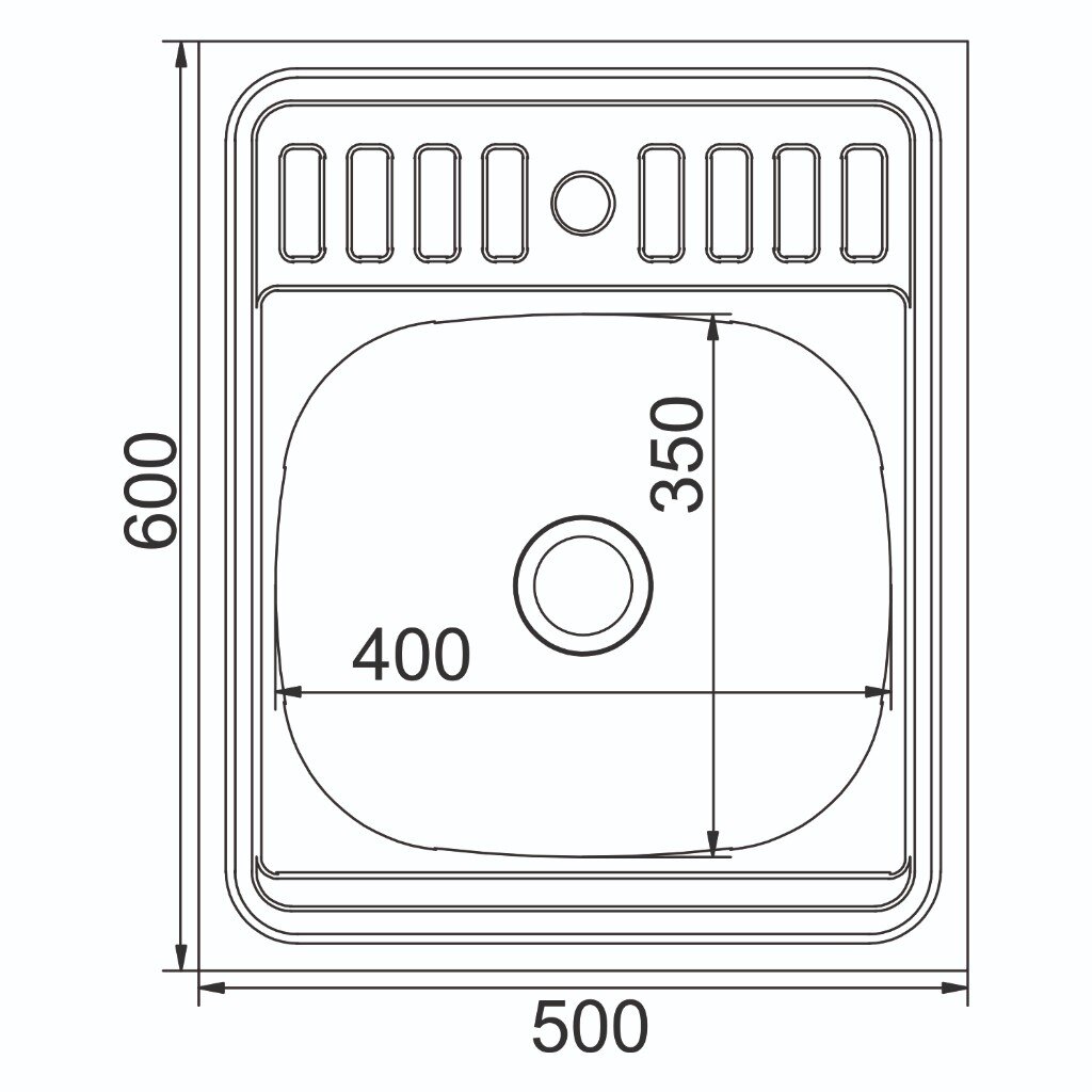 Размер мойки — 500х600 мм (50х60 см), глубина чаши — 0.4 мм. Подходит для большинства стандартных кухонных тумб, легко устанавливается сверху.