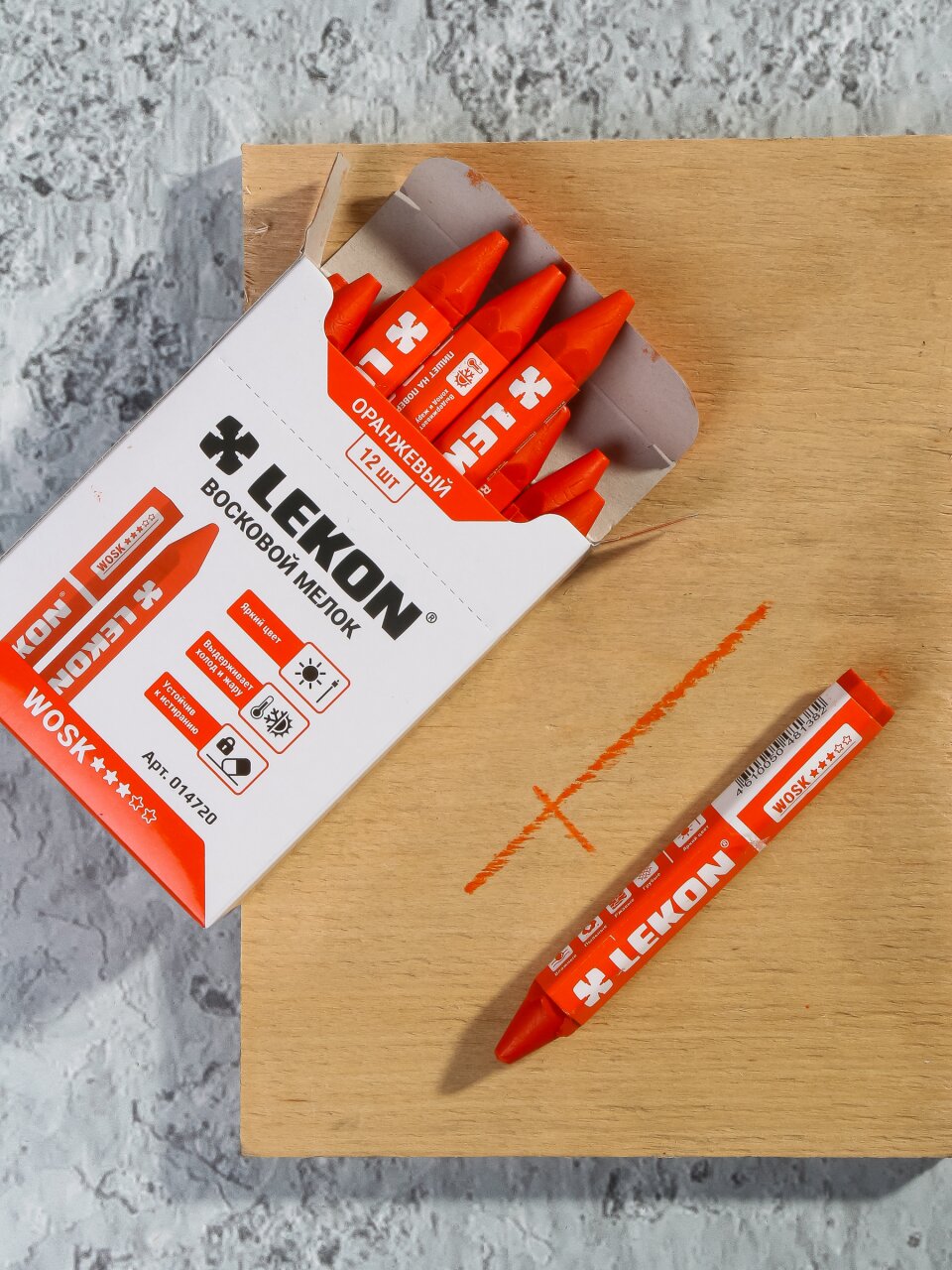 Восковой мелок Lekon Wosk специально разработан для нанесения меток на влажных, грязных, ржавых или жирных поверхностях. Оранжевый цвет остаётся ярким и видимым даже после воздействия воды или грязи.