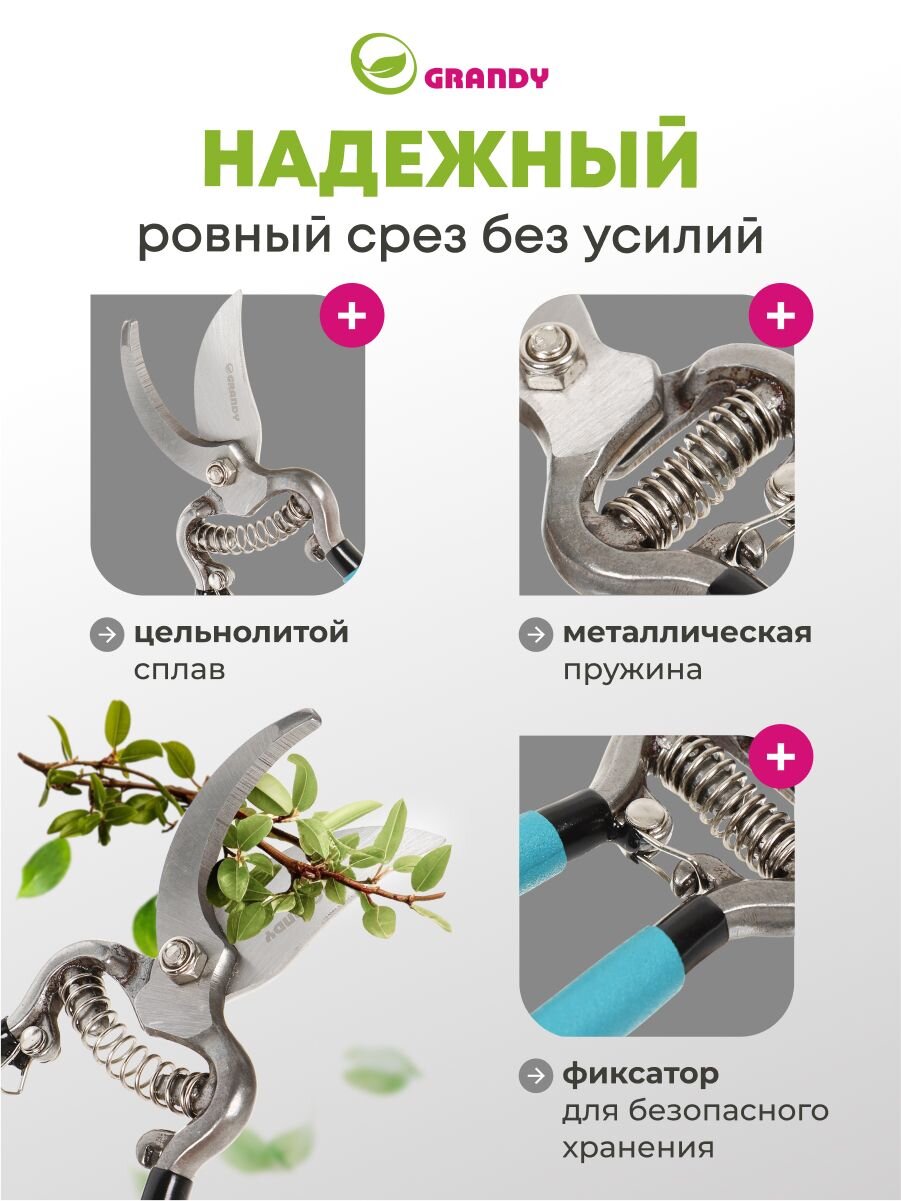 Секатор Grandy предназначен для выполнения работ по уходу за садом. Секатор с прямым резом, обрезиненными рукоятками и боковым фиксатором. Рекомендуется для обрезки живых веток диаметром до 15 мм.