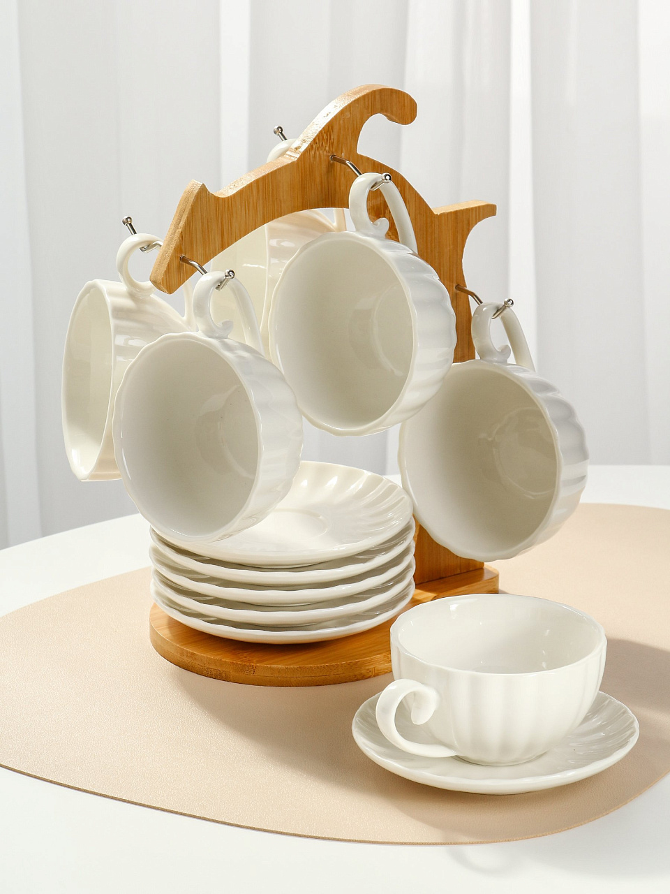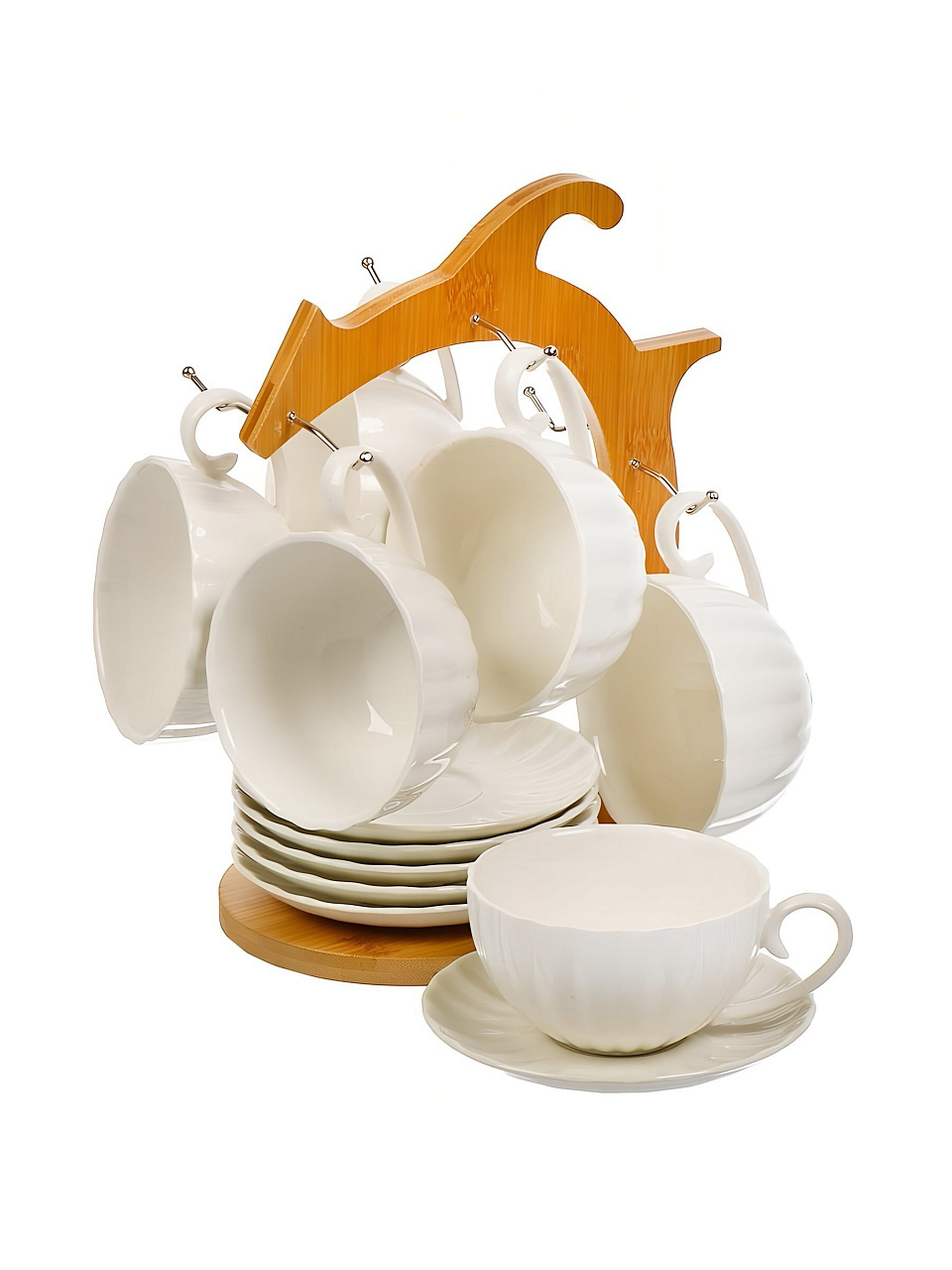 Чайный набор керамический на 6 персон с бамбуковой подставкой Y4-6613 — стильный подарок и уют для дома: 12 предметов, современный дизайн, подарочная упаковка.