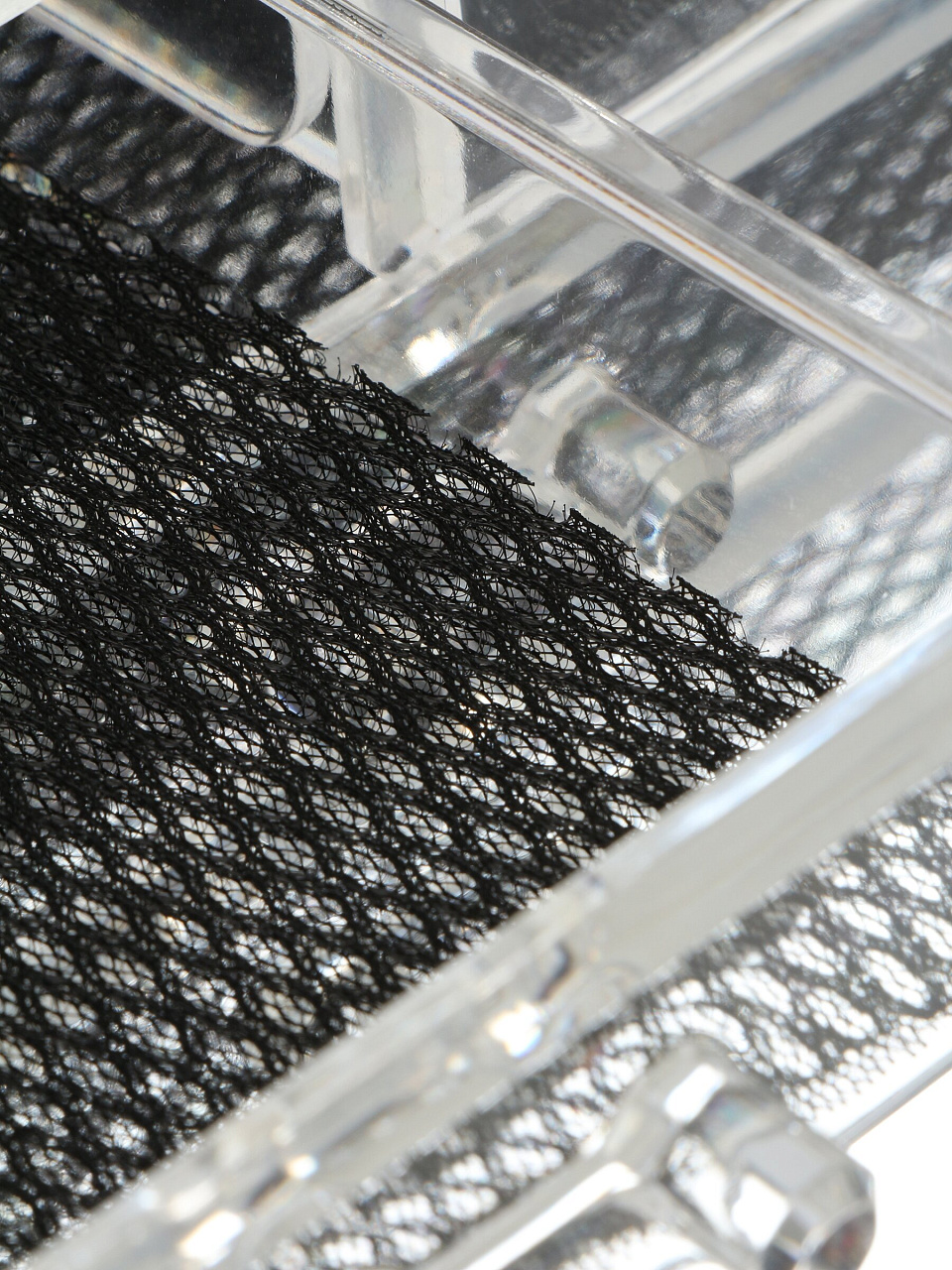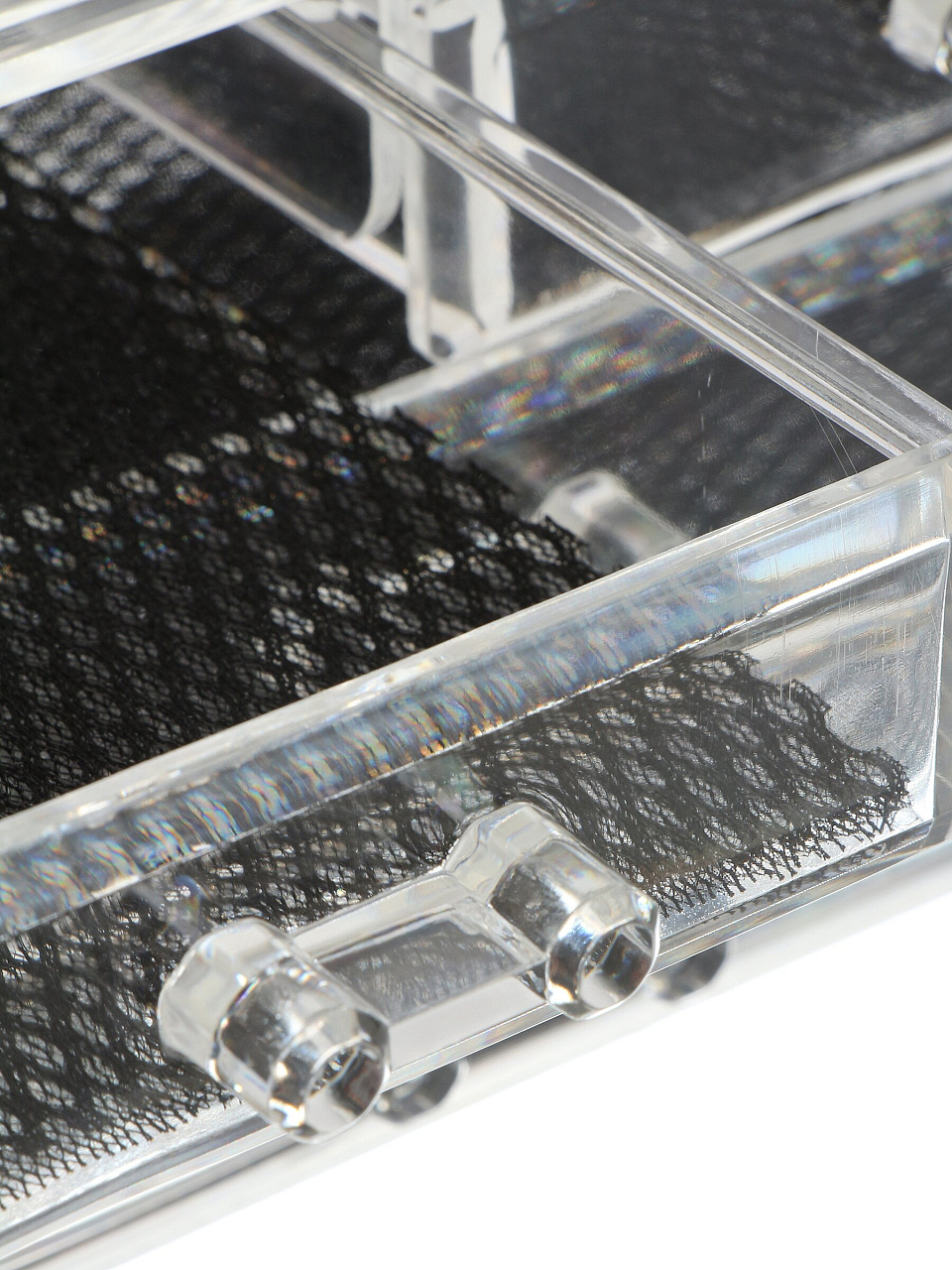 Шкатулка полностью выполнена из бесцветного пластика, который не впитывает запахи, легко моется и не царапает украшения.